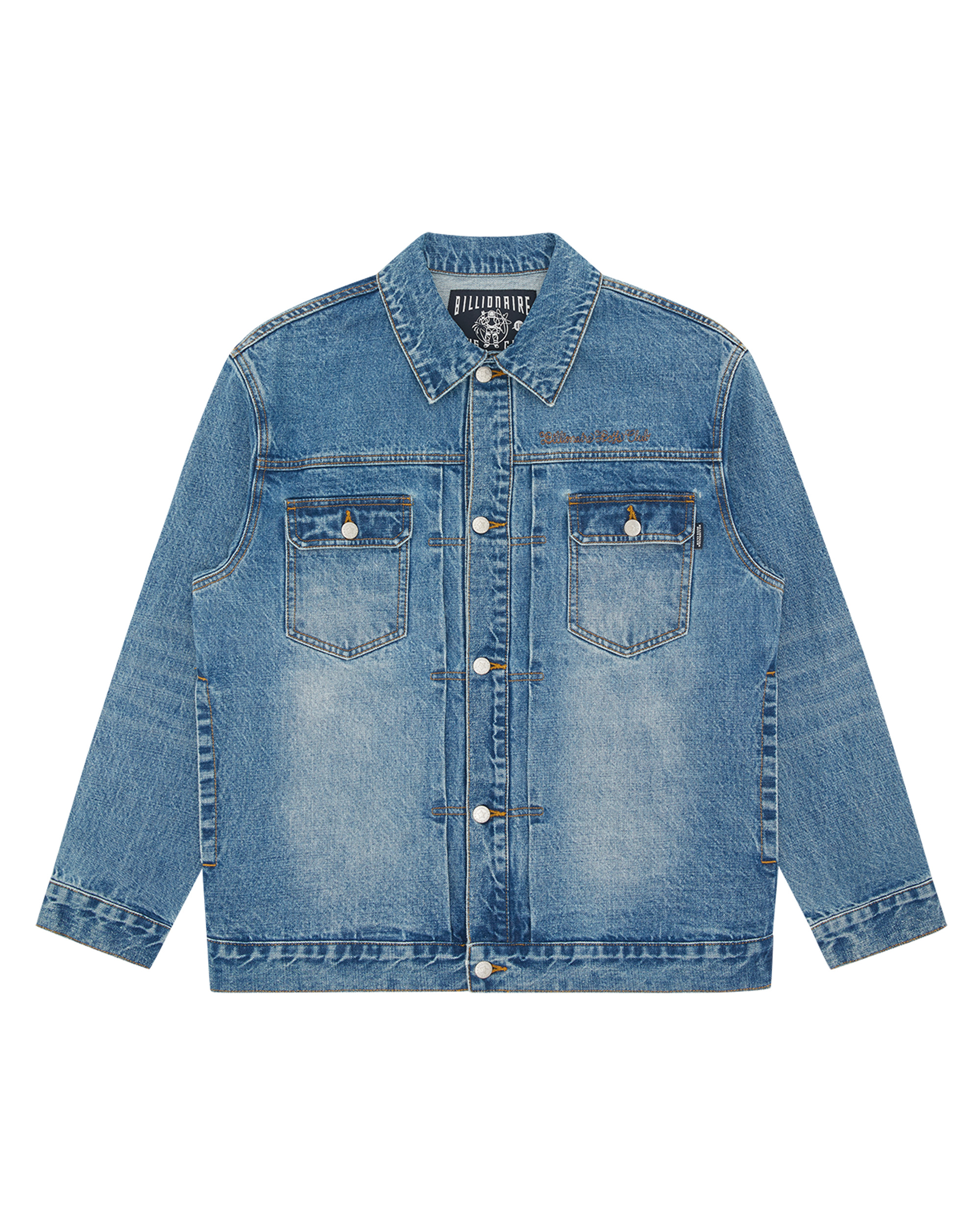 Script Logo Denim Jacket presenting the Billionaire Boys Club script logo embroidered at the back and at chest pocket. - Heavy Wash Blue - Regular Fit - Embroidered Billionaire Boys Club at chest pocket - Embroidered Billionaire Boys Club - script logo on the back - Branded buttons - Branded label at back - 100% Cotton