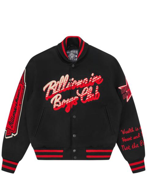 Script OG Varsity Jacket featuring multi graphics chenille embroideries on both the sleeves and front; it is detailed with a full-length embroidered chenille Astro helmet on the back. - Black - Embroidered chenille Billionaire Boys Club Script logo on the front - Embroidered felt patches on the sleeves - Embroidered chenille Astro helmet on the back - Chain stitched Billionaire Boys Club mantra on the sleeve - Popper-fasten branded closure hiding the zip - Elasticated waistband and cuffs - Diamond quilted lining with internal pocket - Two front pockets - Shell: 50% Wool, 50% Polyester; Lining/Filling: 100% - Polyester
