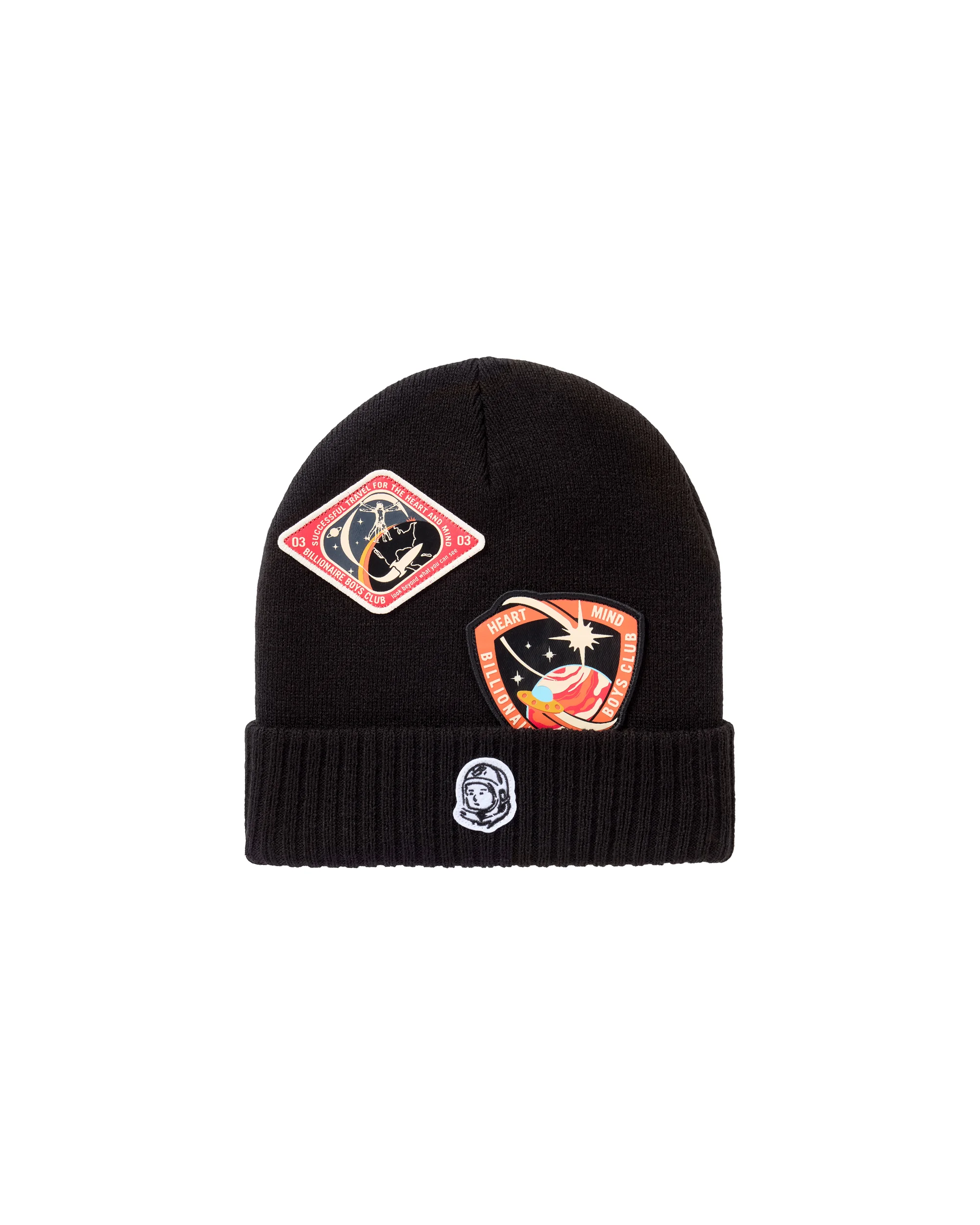 The Stamps Beanie features multiple embroidered space-inspired patches. Highlighting cities like Tokyo, London, Virginia Beach, New York, and Miami. - Black - Embroidered patches - 100% Cotton