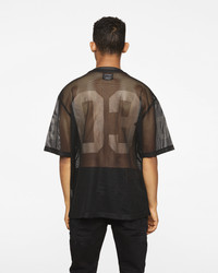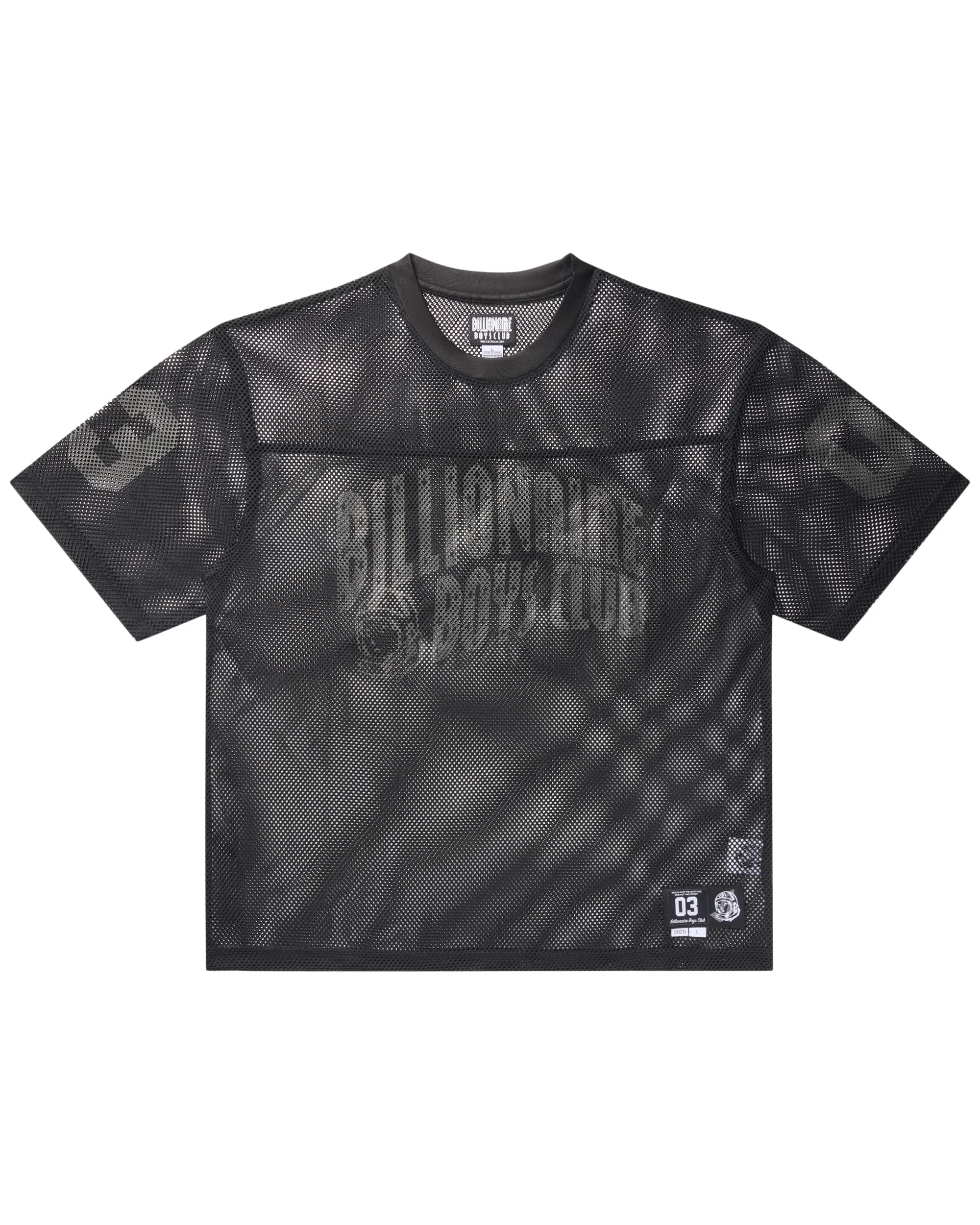 The Varsity Tee is a mesh tee that features the Curve logo on the front chest, with the number "03" printed on both the sleeves and back. - Black - Cropped, boxy fit - Screen-printed graphics on the front, sleeves, and back. - 100% Polyester