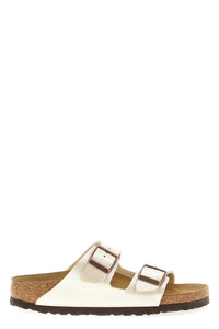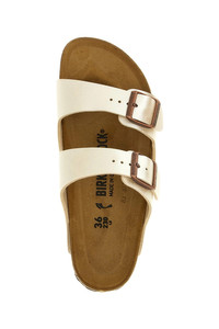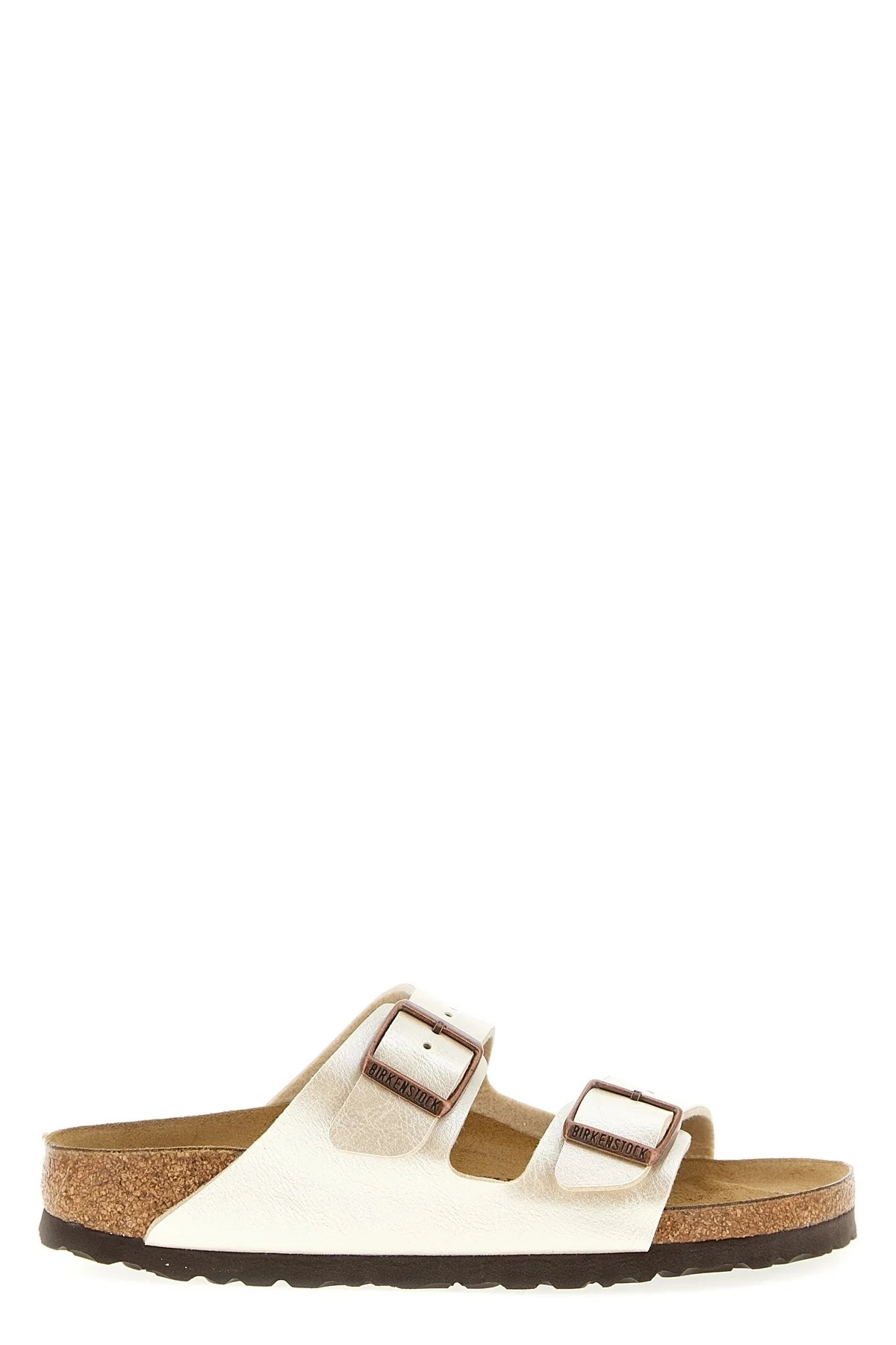 cod. 1009921PEARLWHITE 'Arizona' sandals in Birko-Flor® fabric with shiny silk effect coating, straps with adjustable antiqued metal buckles, anatomical cork and latex footbed, cork insole, EVA sole. Color: White Size & Fit: EU UNISEX - narrow fit Composition: 100% birkoflor Made in: Germany