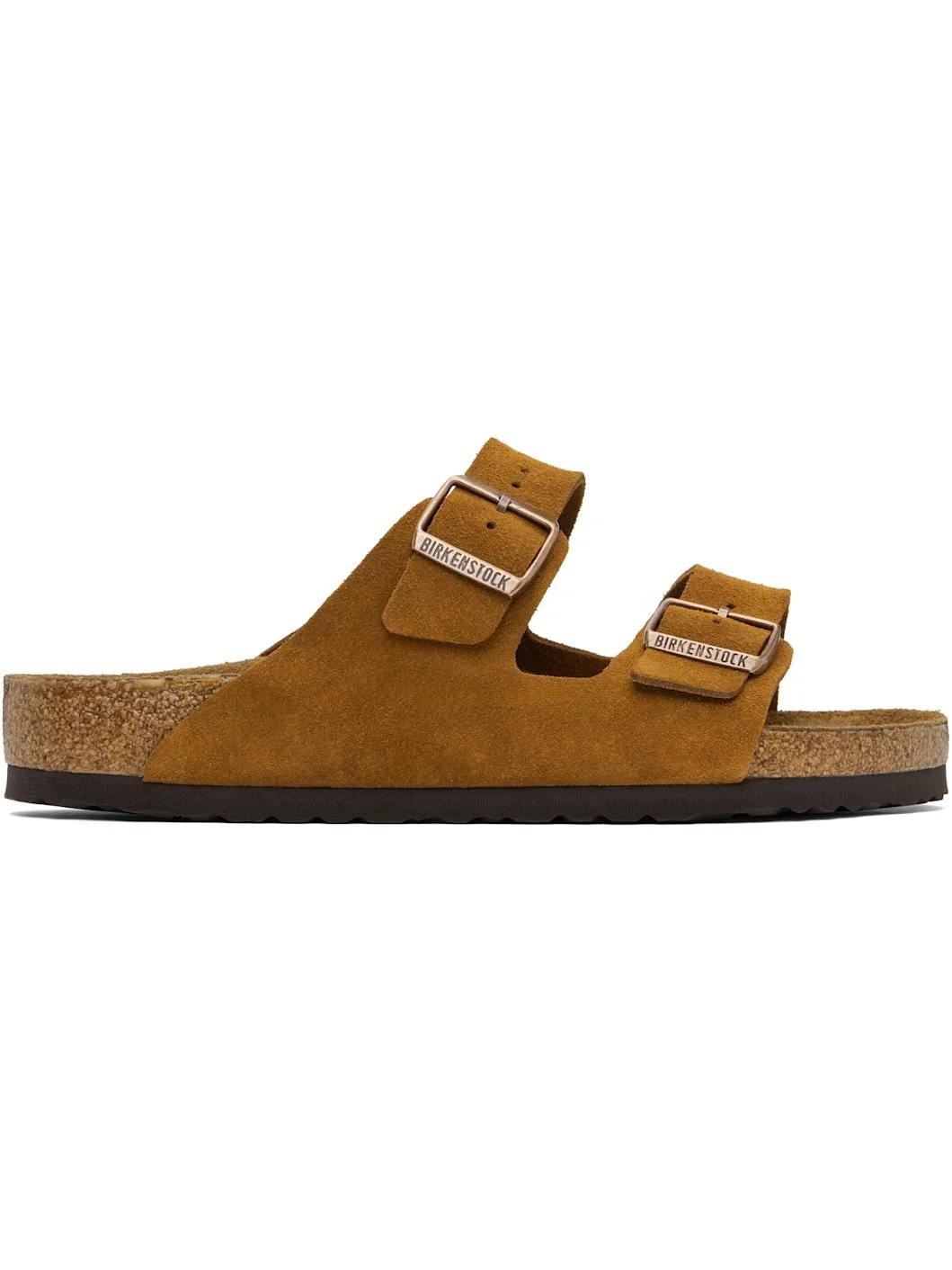 Suede slip-on sandals in tan. · Adjustable pin-buckle straps at vamp · Logo embossed at inner side · Logo stamp at molded suede footbed · Cork midsole · Treaded rubber sole · Logo-engraved antiqued copper-tone hardware Supplier color: Mink Upper: leather. Sole: rubber. Made in Germany 251513M234019