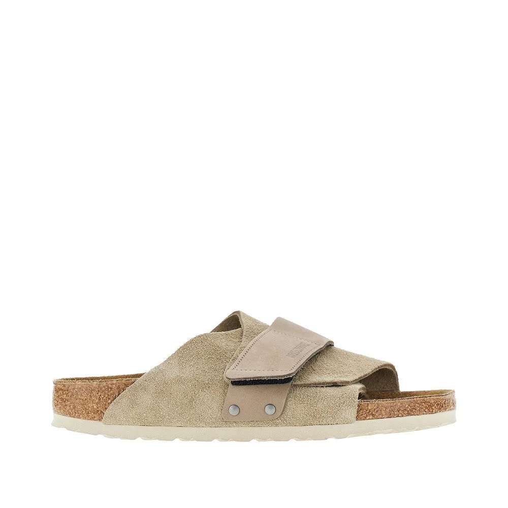 Kyoto sandals made from soft suede leather featuring nubuck leather strap with debossed logo. Adjustable velcro closure. Cork and latex anatomical footbed with suede leather lining. EVA sole. DETAILS Model code: 1015573 Color code: TAUPE Season: SS26 Material: 100% LH Made in: Germany Sku: 32289 Color: Beige Brand: BIRKENSTOCK