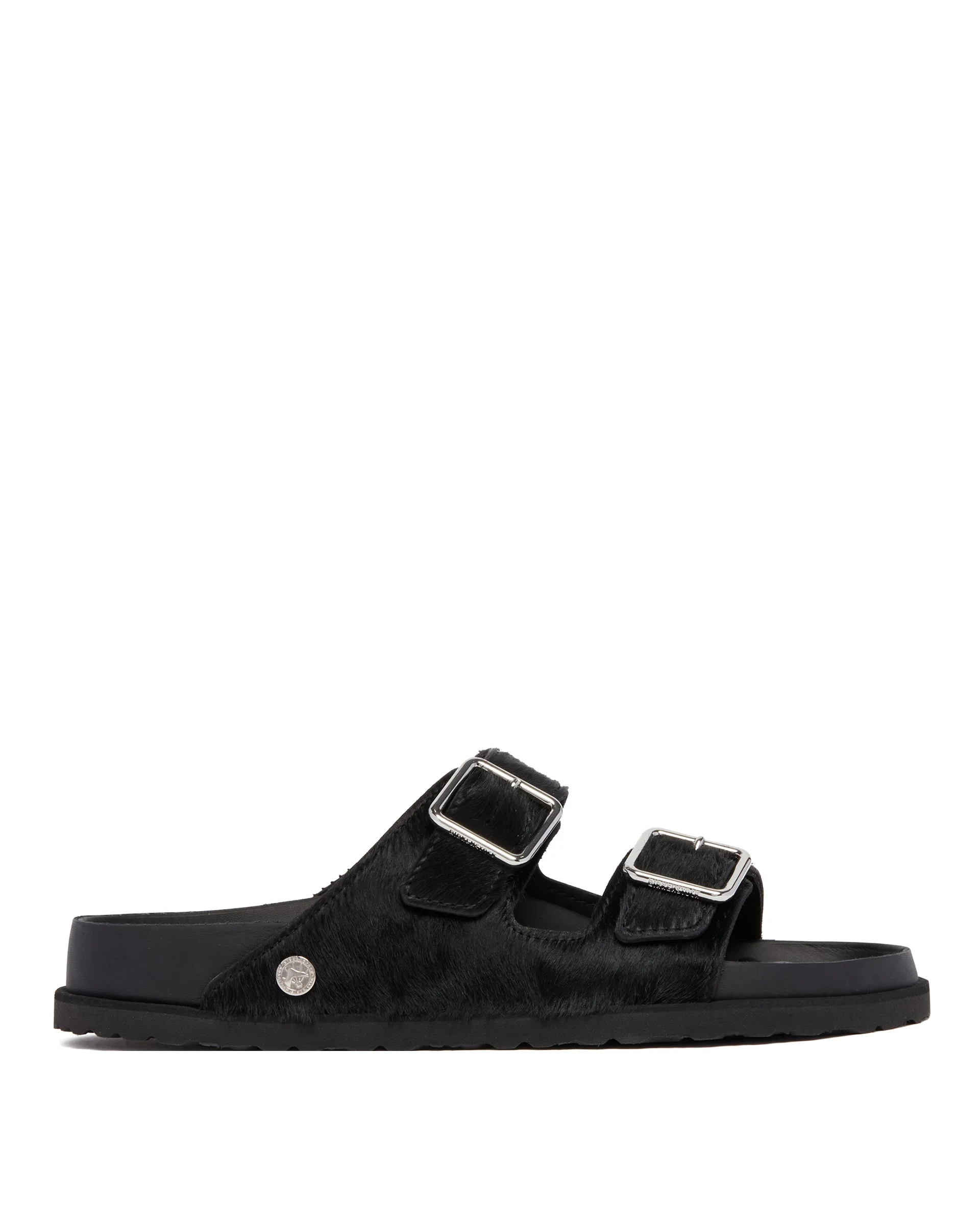 Birkenstock Black 1774 Arizona Slippers. Black pony hair upper, tonal leather-lined anatomical cork and latex footbed, iconic double strap with large buckles. EVA outsole, slip-on style. DETAILS Model: 1031763_BLACK Composition: 100% Leather; Details: 100% Brass; Sole: 100% Rubber Made in: GERMANY Season: FW25-26