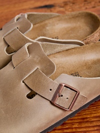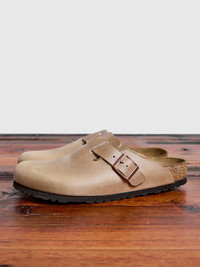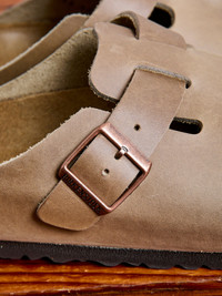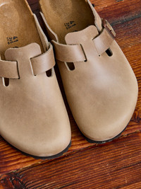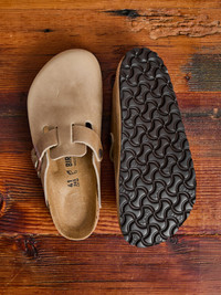 A staple since 1979, the Boston is Birkenstock's signature clog, featuring a one-piece natural leather upper and the brand's proprietary 'Birkengrip' outsole. This iteration includes a lightweight EVA midsole and a heavy-duty brass buckle. Fitted with the brand's suede-lined, anatomically shaped cork footbed, these clogs are designed to mold to the wearer's feet over time, ensuring a comfortable, custom-tailored fit. - Natural leather upper - Suede-lined anatomically shaped cork latex footbed - Lightweight EVA midsole - Anti-slip 'Birkengrip' outsole - Brass buckle - Made in Germany