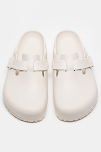 Birkenstock unisex standard fit “Eggshell” white EVA Boston. Features a one-piece waterproof, shock-absorbent, molded EVA upper, an anatomically shaped footbed, and adjustable buckle straps Fit - Regular width - European unisex sizing Feature - Slip-on front with adjustable buckle - EVA upper - Rounded toe - Anatomically shaped EVA footbed Fabrication - Style #1027381 SKU: 1027381-41