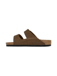 Corduroy-embossed suede slip-on sandals in brown. · Open toe · Adjustable pin-buckle straps at vamp · Logo embossed at inner side · Logo stamp at molded suede footbed · Cork midsole · Treaded EVA rubber sole · Logo-engraved antiqued gold-tone hardware Supplier color: Dark tea corduroy Upper: leather. Sole: cork, rubber. Made in Germany 242513M234009