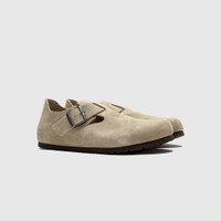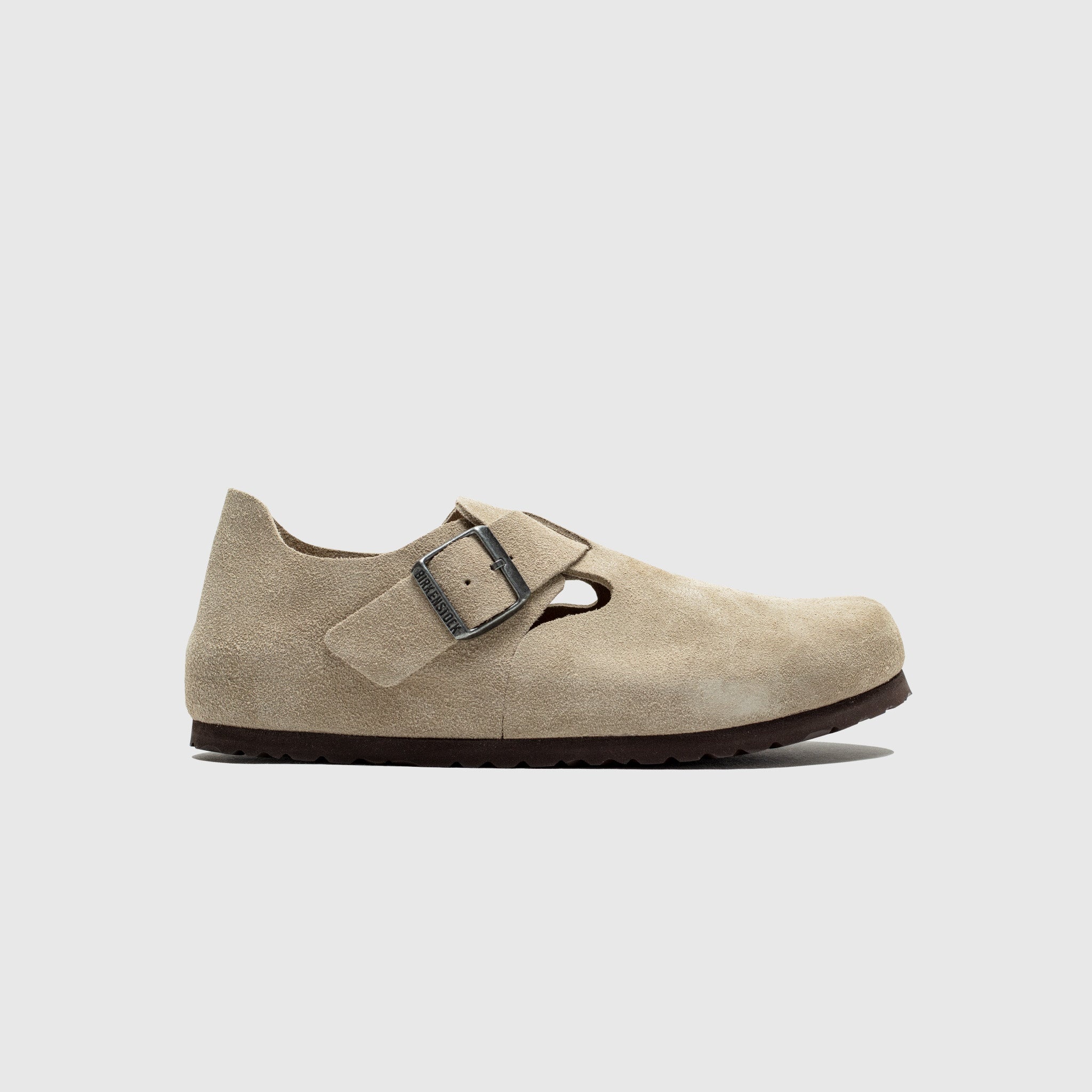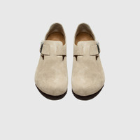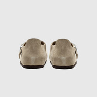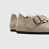 - 1010503 - Taupe - Suede upper - Adjustable buckle strap - Embossed branding - Cork footbed - EVA outsole - Made in Portugal