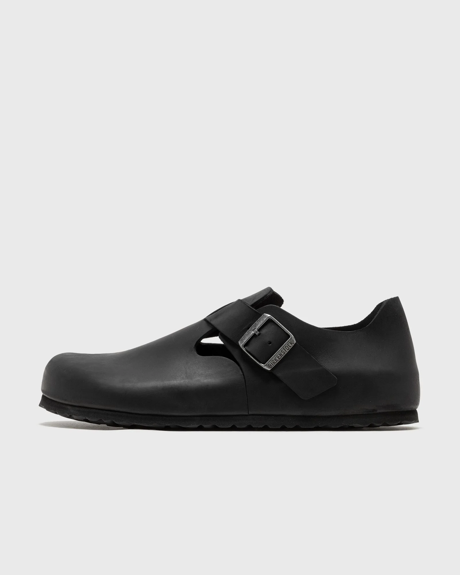 The Birkenstock London Oiled Leather combines comfort and design. Characteristic of the seamless shoe is its raised heel section. Its natural design with an upper made of particularly thick. oiled nubuck leather is emphasized by the open-edged, lining-free finish. - Anatomically shaped footbed - Upper: oiled nubuck leather - Sole: EVA - Individually adjustable metal thorn buckle Article number: 166541 Gender: men Color: Black Material: 30% Rubber, 70% Leather