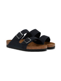 Corduroy-embossed suede slip-on sandals in navy. · Open toe · Adjustable pin-buckle straps at vamp · Logo embossed at inner side · Logo stamp at molded suede footbed · Cork midsole · Treaded EVA rubber sole · Logo-engraved antiqued gold-tone hardware Supplier color: Midnight corduroy Upper: leather. Sole: cork, rubber. Made in Germany 242513M234008