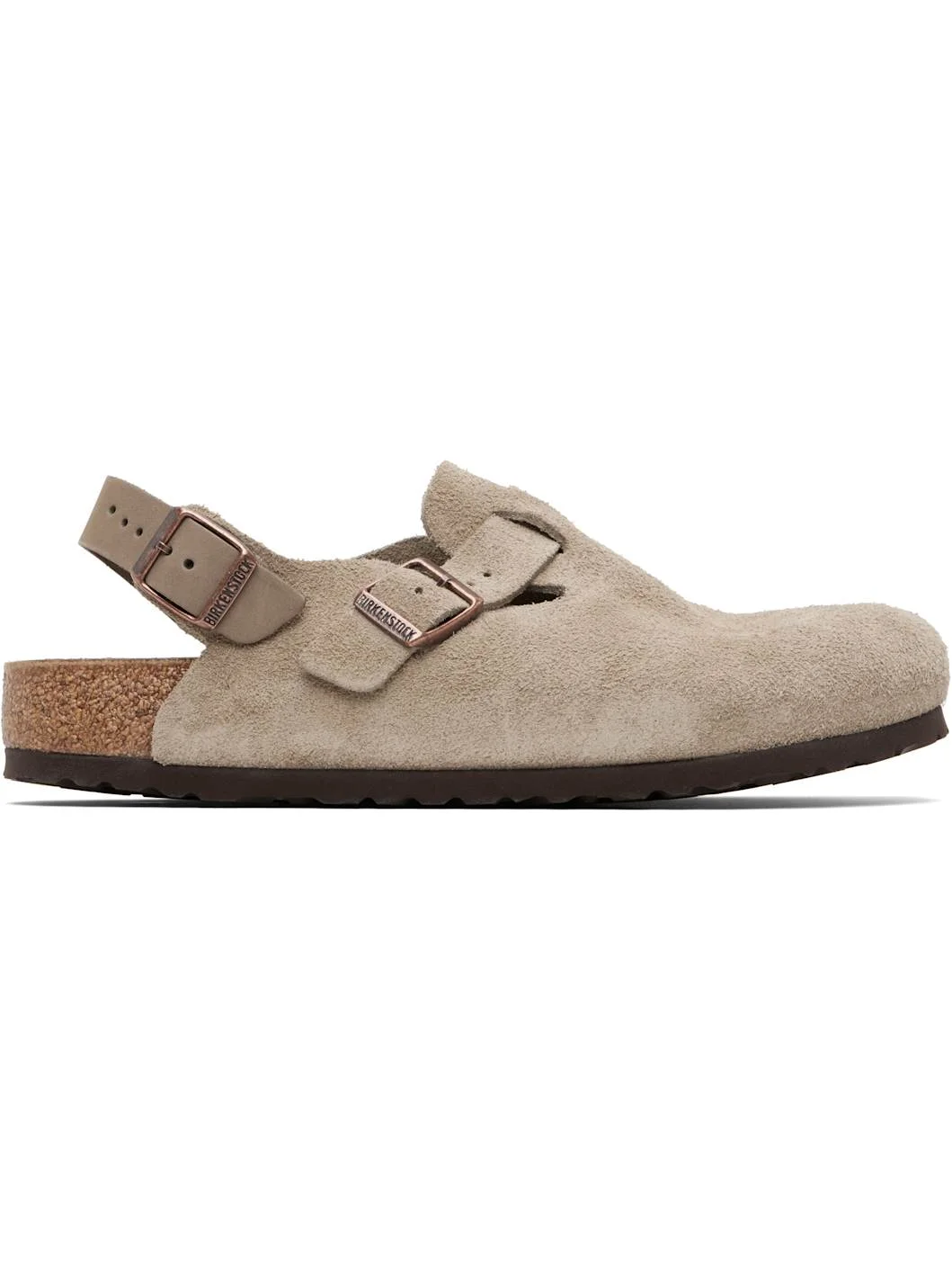 Suede slip-on loafers. · Pin-buckle strap at vamp · Pin-buckle slingback strap · Logo embossed at inner side · Logo printed at molded footbed · Cork-latex midsole · Treaded rubber sole Supplier color: Taupe Suede Upper: leather. Sole: rubber. Made in Germany 261513M231019