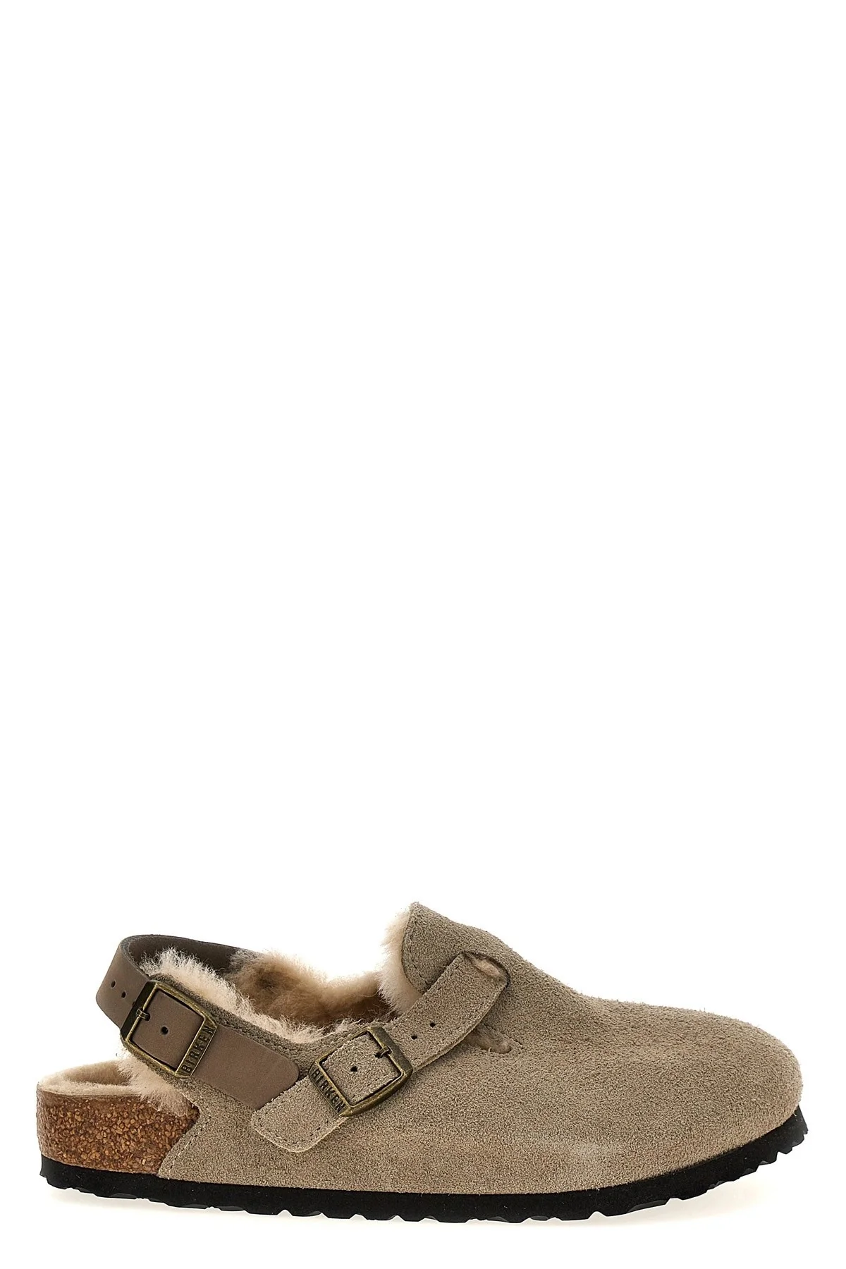 cod. 1028349TAUPE 'Tokio' suede mules with lamb fur lining, straps with adjustable metal pin closures, cork fussbett, EVA sole. Color: Gray Size & Fit: EU UNISEX Composition: 100% leather Made in: Germany