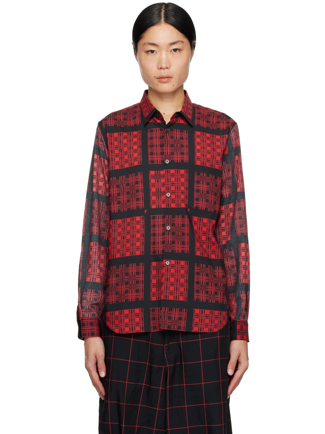 Polyester broadcloth shirt. Fading and graphic pattern printed throughout. · Spread collar · Button closure · Patch pocket · Shirttail hem · Single-button barrel cuffs · Box pleat at back yoke Featuring artwork by Filip Pagowski. Supplier color: Black/Red/Black