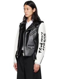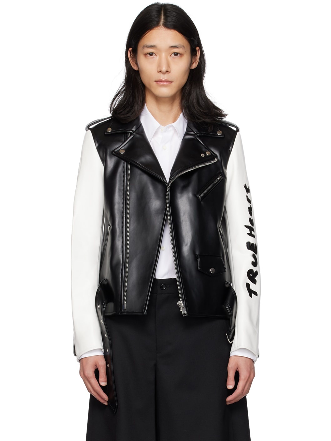 Buffed faux-leather jacket. · Paneled construction · Open spread collar · Zip closure · Zip pockets and flap pocket · Integrated pin-buckle belt at hem · Epaulettes · Metal eyelets at armscyes · Text printed at sleeve · Zip extension panel at cuffs · Full satin lining Supplier color: Black/White