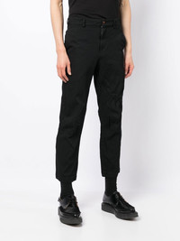MID-RISE CROPPED TROUSERS FROM BLACK COMME DES GARCONS FEATURING BLACK, CONCEALED FLY AND BUTTON FASTENING, BELT LOOPS, TWO SIDE SLIT POCKETS, REAR WELT POCKET, REAR FLAP POCKET AND CROPPED LEG.