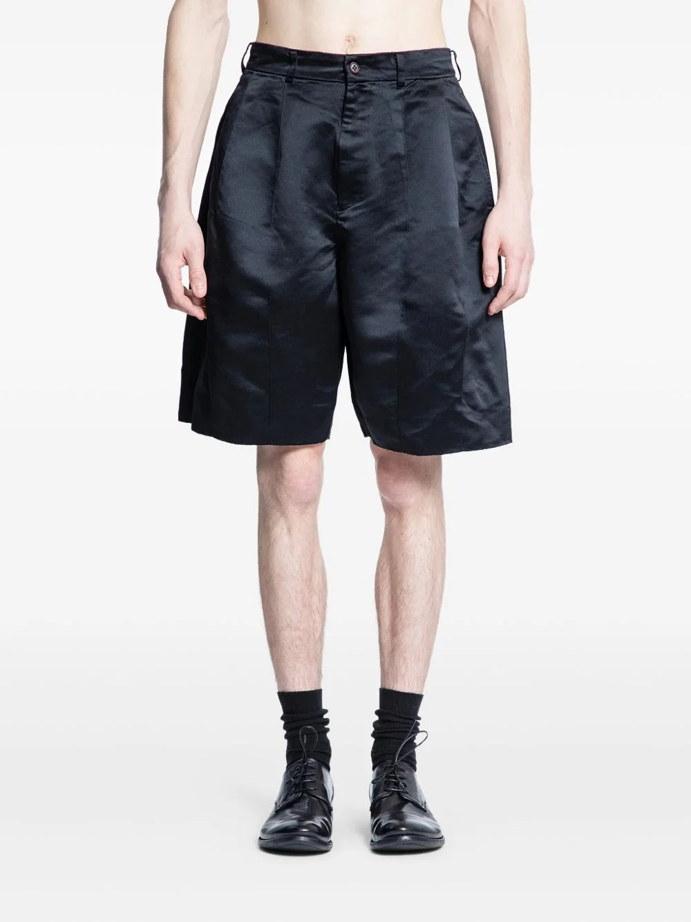 pleated satin-effect tailored shorts Highlights - Black - Pleated design - Satin effect - Button fastening - Rear welt-pockets Imported Composition Polyester 100% Washing instructions Read Manufacturer Guidelines
