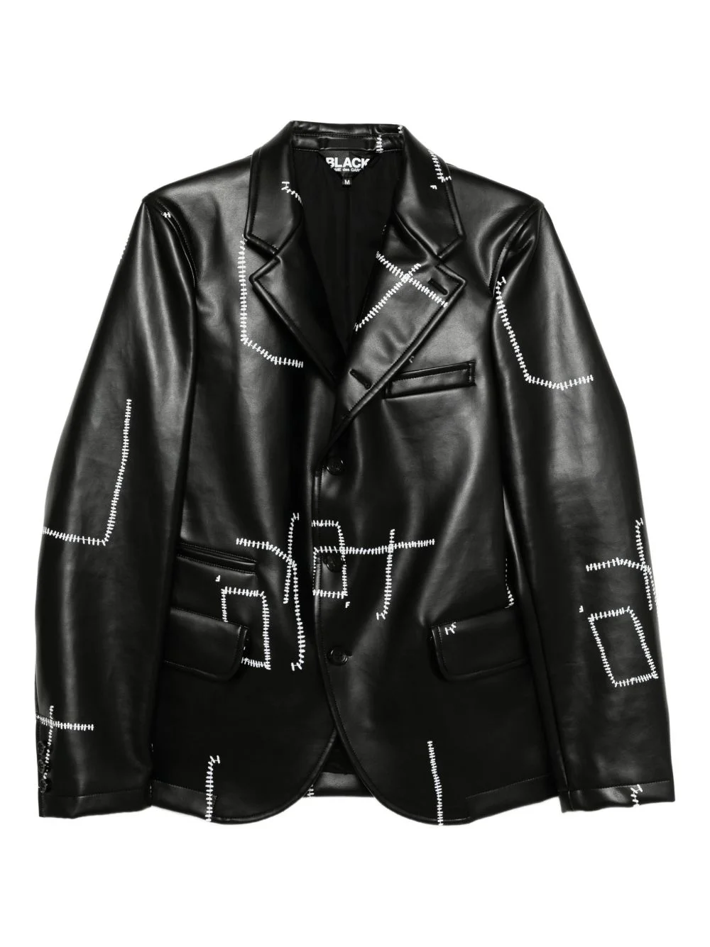 stitch detail-printed blazer Highlights - Black - Front button fastening - Chest welt pocket - Two front flap pockets - Central rear vent Imported Composition Lining: Cupro 100% Outer: Polyurethane 100% SIZE & FIT Model measurements Height 6 ft 1 in(1.86 m) Bust/Chest 33.46 in(85 cm) Hips 35.43 in(90 cm) Waist 31.1 in(79 cm) FittingInformation Designed for a slim fit, offering a comfortable fit that sits just away from the body The vented hem offers movement at the rear Firm leather offering little flexibility to maintain its durability and sturdiness Washing instructions Dry Clean Only