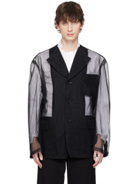 Sheer nylon mesh blazer. · Raw edge at round neck, notched lapel, and hem · Button closure · Welt pocket and flap pockets · Surgeon's cuffs · Central vent at back hem · Unlined Supplier color: Black Body: 100% nylon. Lining: 100% cotton. Made in Japan 251935M195003
