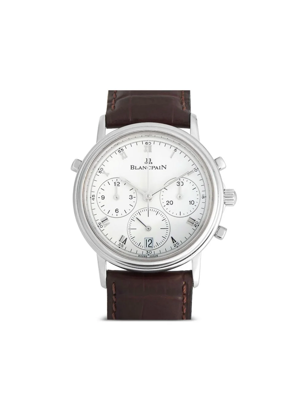 Villeret 34mm Highlights - White dial - Platinum - Three chronograph sub-dials - Date window dial feature - Roman numeral hour markers - Baton hands - Stepped convex bezel - Round case 34mm - Self-winding movement - This item comes with a standard one-year warranty from the boutique. - Condition: excellent. this previously owned item is in near-perfect condition with no signs of damage or use. Imported Composition Platinum 100%, Calf Leather 100% SIZE & FIT Measurement Case size 1.33 in(34 mm)