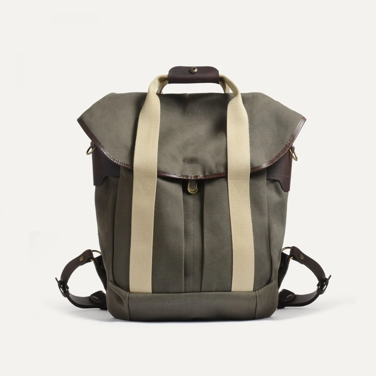 MEN'S BACKPACK Inspired by the business Musette, the Chiloe backpack is the embodiment of the new classic utilitarian chic from Bleu de Chauffe. Designed for urban travel, a day at work, or trips out on two wheels, Chiloe combines the precision of a classic bag with a free, outdoor look. The Chiloe backpack is made from British Millerain cotton serge canvas (590 g/m²), renowned for its durability and resistance to the weather. This high-quality canvas provides complete protection for your belongings, with a stylish weave that is soft to the touch. The vegetable-tanned leather handles, strap, and details add a touch of class while strengthening the bag. It has something of the modern photo-journalist’s bag, with its multiple pockets designed to hold all your essentials: laptop, charger, notebook, cables. It's equipped with a protective felt pocket for computers up to 16" MacBook Pro. You can also slip in a tablet or magazine, and an interior zipped pocket in cotton canvas completes the interior layout. The front of the bag has two exterior pockets under the flap for storing your wallet, computer cables, and other small accessories. To protect the contents from the weather, the flap closes with a tuck lock clasp engraved with the name “Bleu de Chauffe” – artisanal elegance and functionality combined. You can carry it by the handles for a chic look, while the felt-lined shoulder straps ensure complete comfort for the day-to-day. Size: H 46 x W 34 x D 13.5 cm Volume: 20 liters. Each bag is unique, signed on the inside by the artisan who made it at our workshop in the Averyron region. MATERIALS The Chiloe is made from British Millerain canvas, an exceptional hi-tech fabric with a twill weave (590 g/m²) coated with dry wax. This finish ensures natural protection against the rain, abrasion, and everyday wear and tear. Just like leather, this canvas will develop an attractive patina over time, gradually unveiling its natural beauty with each use. The details are made from vegetable-tanned leather. This naturally sturdy full-grain leather develops a beautiful patina, telling your story as time passes. - Vegetable-tanned leather patch - Felt pad for extra comfort - Engraved clasp featuring the Bleu de Chauffe logo - Built-in felt laptop sleeve - Two front pockets under the flap - Inner removable zipped cotton pocket dated and signed by the artisan who made the bag - Bleu de Chauffe label SIZE External dimensions: H 46 x L 34 x D 13.5 cm - Dimension inside felt pocket: H 38 x W 30 (format for laptop 13'', 14'', 15'', 16'' and compatible MacBook Pro 16''). - Internal dimensions of main compartment : H 42 x L 33 x P 13 cm (for laptops up to 16" MacBook Pro) - Dimensions of each of the 2 front pockets under the flap: H 24 x W 12 cm - Volume: 20 liters. We recommend measuring your computer to check it will fit