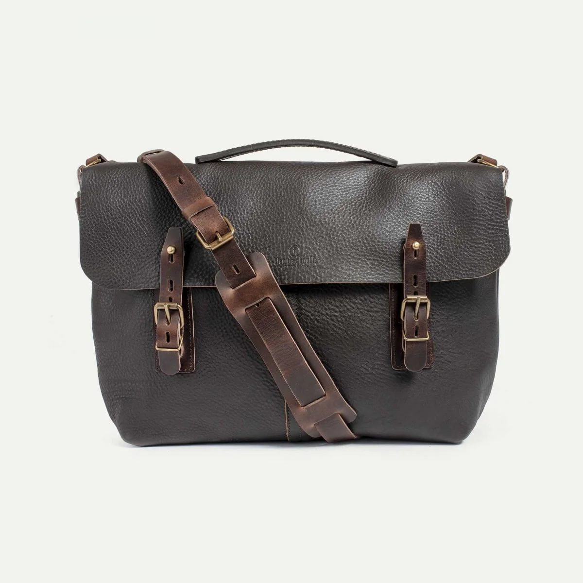 LEATHER SATCHEL BAG MADE IN FRANCE Lucien is the large version of the Bleu de Chauffe satchel. Smart yet still very much in the spirit of workwear, the Lucien bag is quick to open, so you can easily access everything you need. Lucien can be carried either in the hand or over the shoulder, and can easily fit a 15-inch laptop. The inside can be adapted thanks to the SNAP concept which allows pockets to be added to suit each individual’s needs. The Bleu de Chauffe label, signed and dated by the artisan who created the bag, is sewn onto an inside zippered pocket. Size: L 43 x H 30 x W 10 cm Handmade in France. MATERIALS Today, more than 90% of leather in the world undergoes a chrome tanning process which uses heavy chemical components. Bleu de Chauffe has a different approach. Our leather is vegetable tanned which ensures better quality and more sustainable leather, a soft natural touch, and a patina which improves over the years. - Full grain leather, vegetable tanned and water resistant. - A Natural finish which is soft to the touch. Handmade patina. - ‘Velvet' finish on the reverse. - Adjustable leather strap. - A leather handle, making it comfortable to carry by hand. - Removable inside zippered cotton pocket. SIZE - External dimensions : L 43 x H 30 x W 10 cm - Internal dimensions of main compartment: L 40 x H 25 x W 9 cm (for laptops up to 15 inches, fits 16-inch Macbook Pro) - SNAP Concept : thanks to SNAP, you can attach inside your bag our Mirco or Micky ipad sleeves, depending on your needs and daily constraints.