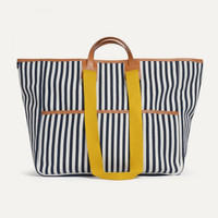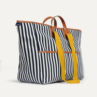 THE MELO, THE 48-HOUR TOTE BAG COMING SOON ! Because our lives are increasingly busy, we have created an XXL version of our iconic Meline tote bag: the Melo, a 48-hour tote bag. Perfect for all your outings, shopping, travel, or business: you will be surprised by the Melo's XXL capacity! For the summer season, the Melo 48H tote bag will win you over with its summery vibe. It features a beautiful textured, striped canvas with a pop & beach spirit that will immediately make you want to hit the road. We selected this canvas from a Spanish manufacturer that works with major luxury brands. On the technical side, it has a high weight of 580 g/m², ensuring robustness and durability! This striped pattern goes perfectly with the wide ochre yellow cotton straps for shoulder carrying. Bleu de Chauffe's star tote bag this season adds a fresh and vibrant touch to your look. The bonus: the handles and edges are made from beautiful vegetable-tanned leather for a very chic finish. Its dual carrying options, by hand or over the shoulder, ensure great versatility. It also has two front pockets measuring 22 cm by 19 cm, ideal for keeping your essentials close at hand. Thanks to its SNAP system, it can easily be transformed into a business bag by adding a laptop pocket. Size: L 45 cm x H 37 cm x D 20 cm Made in France. MATERIALS For the Melo tote bag, we have selected a textured, striped cotton canvas from a Spanish manufacturer that works with major luxury brands. In terms of technical specifications, it has a high weight of 580 g/m², ensuring robustness and durability! - Vegetable-tanned leather inserts and handles - Yellow ochre handles - Two front patch pockets - Zippered closure - Removable interior zippered cotton pocket dated and signed by the artisan who made the bag - Bleu De Chauffe label SIZE - Dimensions: L 45 cm x H 37 cm x D 20 cm - Cabin dimensions - Volume: 30L - Front pocket dimensions: L 22 cm x H 19 cm Handle and strap dimensions: Handle length: 27 cm Handle width: 2 cm Strap length: 83 cm Strap width: 4 cm and 2 cm in the middle Strap drop*: 27 cm *The drop is the height between the top of the bag and the top of the shoulder strap The handles and straps have been designed to offer great flexibility of use, with the handles allowing the bag to be carried by hand and the straps allowing it to be carried on the shoulder. Their width ensures balanced weight distribution and a good grip, guaranteeing maximum comfort even during prolonged use.