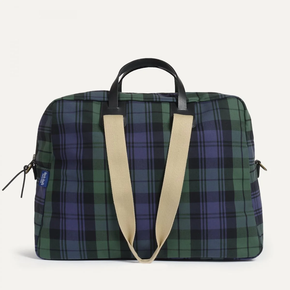 AVIATOR TRAVEL BAG The Missak travel bag is more than just a piece of luggage: it is an invitation to travel, to dive into the world of the pioneers of aviation. Taking inspiration from the bags used in the cramped cockpits of the early 20th century, it combines the authenticity of this legendary model with a functionality fit for the present day. The Missak travel bag in British Millerain tartan canvas is a tribute to a pattern which is steeped in history, while staying up to date with the needs of the modern traveler. Designed to withstand water, wear, and the most daring adventures, this canvas brings together high-tech durability and timeless style. The vegetable-tanned leather details reinforce the bag and add a touch of class. It has a large, practical opening giving you quick access to all your essentials, and with its cabin-bag dimensions you can take this stylish, functional bag with you everywhere. A large zipped pocket on the back provides an extra compartment so you can keep your most precious belongings close at hand. Dimensions: L47.5cm x H37cm x D22.5cm Volume: 30L Made in France. The inside zipped pocket is dated and signed by the artisan who made the bag. The Missak bag is equipped with two side buckles allowing the addition of a shoulder strap for carrying over the shoulder or across the body. Compatible with the Bandouliere Mousqueton - Black (sold separately). MATERIALS With its iconic checks, tartan evokes the wild landscapes of the Highlands and a tradition rich in symbols, reinterpreted in style with this fabric from British Millerain. This exceptional-quality material gives the Missak bag a bold yet refined look, perfect for the traveler on a quest to find a practical yet perfectly stylish accessory. This carefully-coated canvas is extremely resistant to water and wear, while retaining a softness that makes it ideal for day-to-day use. The heir to a rich, centuries-old Scottish tradition, this British Millerain tartan canvas gives the Missak travel bag an authentic look. - Details and handles in vegetable-tanned leather - Beige straps - Zipped closure with YKK zipper - Large rear zipped pocket - Inside removable zipped pocket dated and signed by the artisan who made the bag - Bleu de Chauffe label SIZE - Cabin-luggage sized - Dimensions: L47.5cm x H37cm x D22.5cm - Volume: 30L - Dimensions of rear zipped pocket: L47cm x H25cm Dimensions of handles and straps Handle length: 35cm Strap length: 70cm Strap drop length*: 29cm Handle width: 2cm Strap width: 4cm, 2cm in the middle *the drop length is the distance between the top of the bag and the top of the strap. The handles and straps have been designed to make the bag incredibly versatile: it can be carried in the hand using the handles or over the shoulder with the straps. Their width ensures the weight is spread evenly and gives a good grip, ensuring optimal comfort even when carried for a long time.