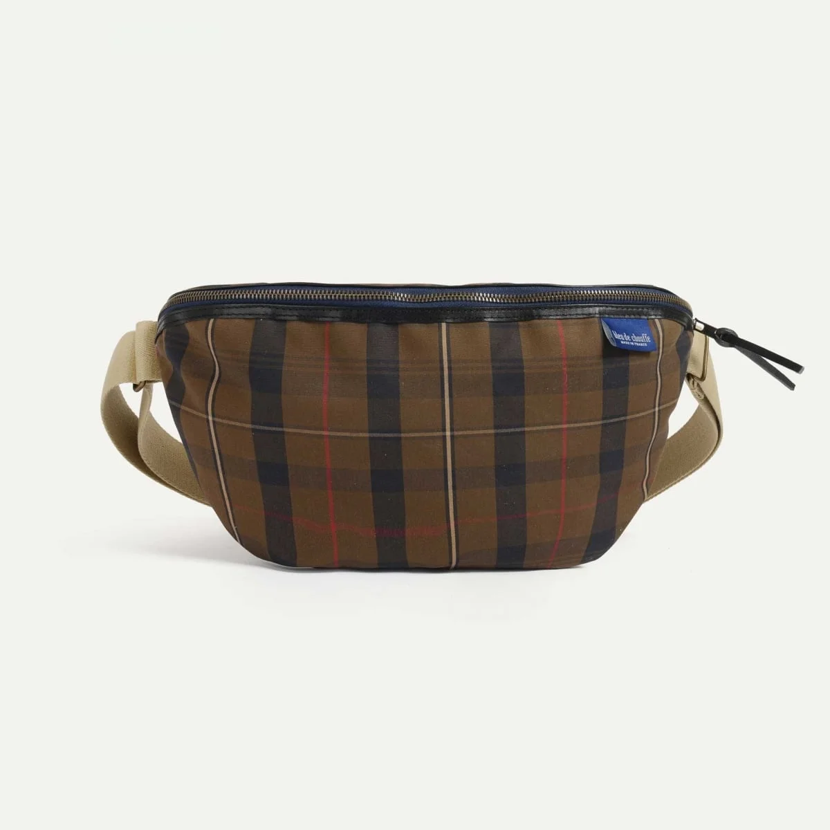 OVERSIZE BELT BAG The Beat XL belt bag features generous dimensions and optimised storage space. Its 6L capacity means you can carry everything you need without compromising on comfort or style. The full tartan version of the Beat fanny pack features an iconic canvas made by British Millerain, specialists in top-of-the-range technical fabrics. This timeless tartan, a symbol of character and elegance, stands out for its robustness and practicality. The vegetable-tanned leather finish adds a touch of elegance and robustness. Its vegetable-tanned leather inserts add a touch of authenticity and sophistication. Its wide, comfortable and sturdy strap makes it comfortable to carry all day long. Inside, a zipped pocket, carefully dated and signed by the craftsman who made the bag, secures your essentials. Dimensions : W 31 x H 21 x D 12 cm Like all Bleu de Chauffe products, the Beat XL fanny pack is made with passion by our leather craftsmen in France, guaranteeing exceptional quality and expertise. Made in France MATERIALS The full tartan version of the Beat XL belt bag gives pride of place to an emblematic canvas made by British Millerain. This carefully coated canvas is extremely resistant to water and wear, while retaining a softness that makes it ideal for everyday use. The heir to a rich Scottish tradition that is centuries-old, this British Millerain tartan canvas gives the Beat belt bag an air of authenticity. - Vegetable-tanned leather inserts - Adjustable strap - Zip fastening YKK zip - Removable inner cotton zip pocket, dated and signed by the craftsman who made the bag - Bleu De Chauffe label SIZE - Dimensions: W 31 x H 21 x D 12 cm - Volume: 6L Strap dimensions Adjustable length: 73 cm to 135 cm Strap drop length*: 30 cm to 62 cm Width: 4 cm *the drop length is the distance between the top of the bag and the top of the strap The shoulder strap is designed to offer great flexibility of use thanks to its adjustable length, allowing it to be worn over the shoulder or across the body, as you prefer. The 4 cm width ensures balanced weight distribution, guaranteeing maximum comfort even during prolonged use.