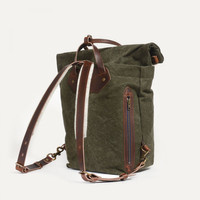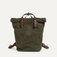 ROLL TOP BACKPACK The Woody is the quintessential Bleu de Chauffe canvas bag, with an outdoor, ‘military’ disposition that makes this range unique. The 25L Woody backpack is a reinvention of old climbing bags. You can wear it as a traditional backpack, or as a hand luggage, thanks to its handles. The Woody backpack is made from stone washed cotton canvas. This high-quality canvas provides complete protection for your belongings, with a stylish weave that is soft to the touch. The vegetable-tanned leather handles, strap, and details add a touch of class while strengthening the bag. The bag integrates 2 outside compartments with a top magnetic closure or a zipper for your accessories as cell phone, wallet, passeport, notebook….It has high storage capacity and fits perfectly for your belongings and a 13” laptop or 15" laptop. The Woody backpack is compatible with the Milan laptop sleeve thanks to the SNAP system. The Bleu de Chauffe label, signed and dated by the artisan, is sewn on an inside zipped pocket. Size : H 42 x L 35 x W 17 cm Volume: 25 liters. Handmade in France. The Woody backpack can be completed with our “PECT” chest strap sold separately (Palissander color), for bike or motorcycle use. MATERIALS Made with the same cotton canvas fabric used to renovate the famous Jeep Willis collector hood. The Bleu de Chauffe canvas is supplied by the very last French canvas manufacturer. - Details in vegetable-tanned leather - Felt shoulder straps for more comfort. - One outside zipped pocket: 27 cm (H) x 19 cm (L) - One outside back pocket with magnetic button closure: 15 cm (H) x 22 cm (L) - One outside front pocket: 16 cm (H) x 20 cm (L) - Inside removable zippered cotton pocket. - Metal details with a bronze finish. - Embossed Bleu de Chauffe logo with a bronze sheen. SIZE - External dimensions: H 42 x L 35 x W 17 cm - Internal dimensions of main compartment: H 41 x L 34 x W 17 cm (for laptops up to 15 inches) - SNAP concept: Thanks to the SNAP concept, you can add a "Milan" felt computer cover to the inside of the backpack to suit your needs. (sold separately) - Volume: 25 liters. We recommend measuring your computer to check it will fit. The braided Leather keychain shown in the photo of the mannequin is sold separately.