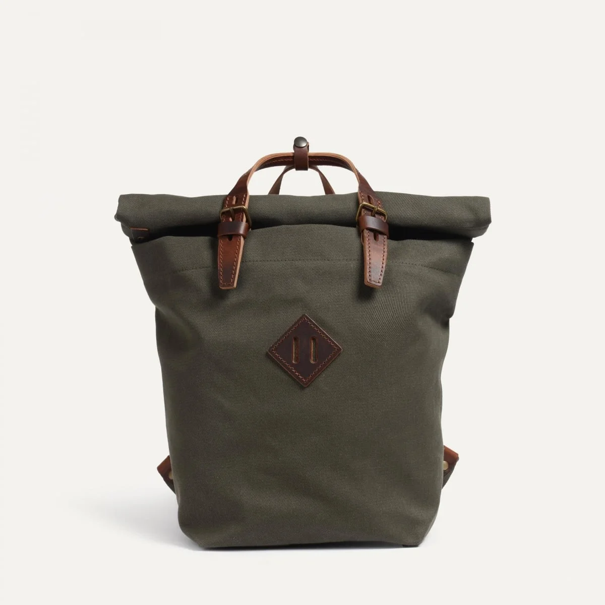 MEN'S AND WOMEN'S ROLL TOP BACKPACK The Woody is the quintessential Bleu de Chauffe canvas bag, with an outdoor, ‘military’ disposition that makes this range unique. For its 10th birthday, we have given it a new serge canvas made by British Millerain (the only name that matters in this domain) which has a super-resistant dried wax coating made to withstand anything (bad weather, stretching…). Another new feature is the comprehensive two-way carrying system: it can be used as a backpack, or as a tote, by tucking the straps away in the pocket on the back. The 25L Woody backpack is a reinvention of old climbing bags. You can wear it as a traditional backpack, or as a hand luggage, thanks to its handles. The Woody backpack is made from British Millerain cotton serge canvas (590 g/m²), renowned for its durability and resistance to the weather. This high-quality canvas provides complete protection for your belongings, with a stylish weave that is soft to the touch. The vegetable-tanned leather handles, strap, and details add a touch of class while strengthening the bag. The bag integrates 2 outside compartments with a top magnetic closure or a zipper for your accessories as cell phone, wallet, passeport, notebook….It has high storage capacity and fits perfectly for your belongings and a 13” laptop or 15" laptop. The Woody backpack is compatible with the Milan laptop sleeve thanks to the SNAP system. The Bleu de Chauffe label, signed and dated by the artisan, is sewn on an inside zipped pocket. Size : H 42 x L 35 x W 17 cm Volume: 25 liters. Handmade in France. The Woody backpack can be completed with our “PECT” chest strap sold separately (Palissander color), for bike or motorcycle use. The braided Leather keychain shown in the photo of the mannequin is sold separately. MATERIALS In our workshop, we have selected an exceptional cotton canvas that is water-resistant and offers incomparable durability. The woody backpack is made from 18oz lick wax serge canvas from British Millerain. This 590 g/m² canvas stands out from the crowd, and with its super-close weave that makes it exceptionally resistant to wear and stretching, it is the gold standard in leather goods and baggage. The dry wax, applied with great care, gives it a non-greasy feel and optimal protection against the weather, for guaranteed durability and comfort in an urban environment and on your travels. - Details in vegetable-tanned leather - Felt shoulder straps for more comfort. - One outside zipped pocket: 27 cm (H) x 19 cm (L) - One outside back pocket with magnetic button closure: 15 cm (H) x 22 cm (L) - One outside front pocket: 16 cm (H) x 20 cm (L) - Inside removable zippered cotton pocket. - Metal details with a bronze finish. - Embossed Bleu de Chauffe logo with a bronze sheen. SIZE - External dimensions: H 42 x L 35 x W 17 cm - Internal dimensions of main compartment: H 41 x L 34 x W 17 cm (for laptops up to 15 inches) - SNAP concept: Thanks to the SNAP concept, you can add a "Milan" felt computer cover to the inside of the backpack to suit your needs. (sold separately) - Volume: 25 liters. We recommend measuring your computer to check it will fit. The braided Leather keychain shown in the photo of the mannequin is sold separately.