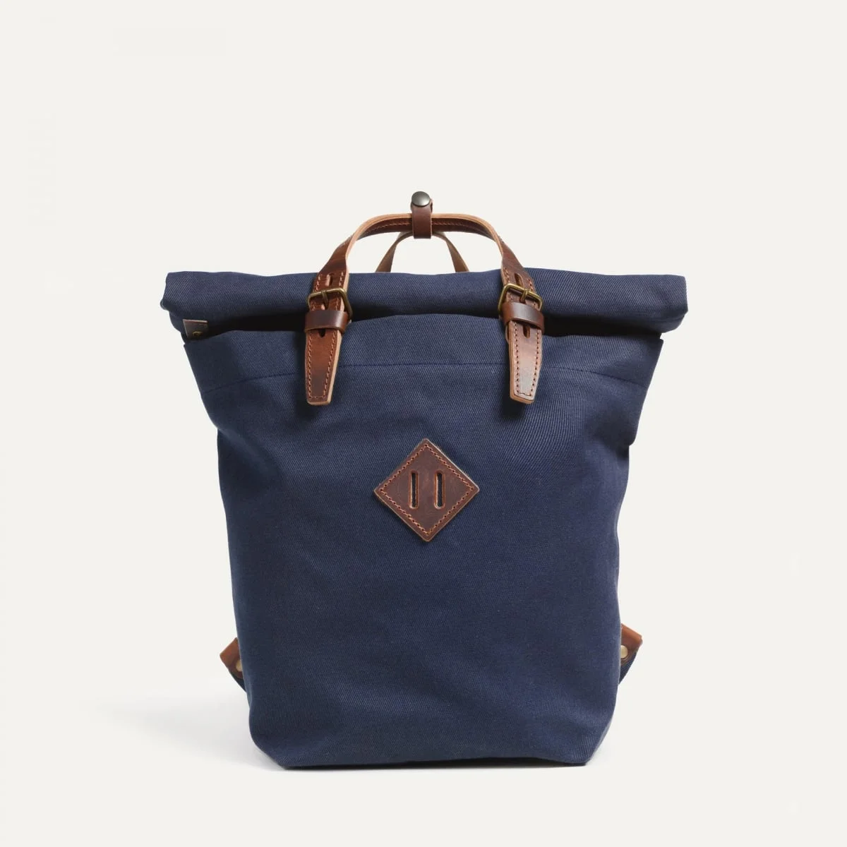 MEN'S AND WOMEN'S ROLL TOP RUCKSACK The Woody is the quintessential Bleu de Chauffe canvas bag, with an outdoor, ‘military’ disposition that makes this range unique. For its 10th birthday, we have given it a new serge canvas made by British Millerain (the only name that matters in this domain) which has a super-resistant dried wax coating made to withstand anything (bad weather, stretching…). Another new feature is the comprehensive two-way carrying system: it can be used as a backpack, or as a tote, by tucking the straps away in the pocket on the back. The 25L Woody backpack is a reinvention of old climbing bags. You can wear it as a traditional backpack, or as a hand luggage, thanks to its handles. The Woody backpack is made from British Millerain cotton serge canvas (590 g/m²), renowned for its durability and resistance to the weather. This high-quality canvas provides complete protection for your belongings, with a stylish weave that is soft to the touch. The vegetable-tanned leather handles, strap, and details add a touch of class while strengthening the bag. The bag integrates 2 outside compartments with a top magnetic closure or a zipper for your accessories as cell phone, wallet, passeport, notebook….It has high storage capacity and fits perfectly for your belongings and a 13” laptop or 15" laptop. The Woody backpack is compatible with the Milan laptop sleeve thanks to the SNAP system. The Bleu de Chauffe label, signed and dated by the artisan, is sewn on an inside zipped pocket. Size : H 42 x L 35 x W 17 cm Volume: 25 liters. Handmade in France. The Woody backpack can be completed with our “PECT” chest strap sold separately (Pain brule color), for bike or motorcycle use. The braided Leather keychain shown in the photo of the mannequin is sold separately. MATERIALS In our workshop, we have selected an exceptional cotton canvas that is water-resistant and offers incomparable durability. The woody backpack is made from 18oz lick wax serge canvas from British Millerain. This 590 g/m² canvas stands out from the crowd, and with its super-close weave that makes it exceptionally resistant to wear and stretching, it is the gold standard in leather goods and baggage. The dry wax, applied with great care, gives it a non-greasy feel and optimal protection against the weather, for guaranteed durability and comfort in an urban environment and on your travels. - Details in vegetable-tanned leather - Felt shoulder straps for more comfort. - One outside zipped pocket: 27 cm (H) x 19 cm (L) - One outside back pocket with magnetic button closure: 15 cm (H) x 22 cm (L) - One outside front pocket: 16 cm (H) x 20 cm (L) - Inside removable zippered cotton pocket. - Metal details with a bronze finish. - Embossed Bleu de Chauffe logo with a bronze sheen. SIZE - External dimensions: H 42 x L 35 x W 17 cm - Internal dimensions of main compartment: H 41 x L 34 x W 17 cm (for laptops up to 15 inches) - SNAP concept: Thanks to the SNAP concept, you can add a "Milan" felt computer cover to the inside of the backpack to suit your needs. (sold separately) - Volume: 25 liters. We recommend measuring your computer to check it will fit. The braided Leather keychain shown in the photo of the mannequin is sold separately.