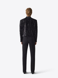 Cropped nehru jacket in velvet paisley embroidery, three button closure and welt pocket at front. MORE DETAILS - 100% Polyester - Fully lined - Classic fit - Four bottom cuffs - Stand collar - Roped shoulder