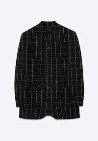Single-breasted uniform jacket in black and white boucle with stand collar, six shiny button front closure, two jetted pockets at waist, and welt pocket at chest. MORE DETAILS - 40% CO, 35% PC, 12% PL, 7% PA - Four-button cuffs - Double vents at back - Decorative AMF stiches - Full canvas construction and roped shoulder - Fully lined