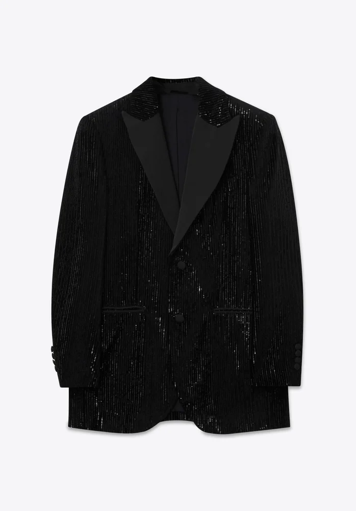 Single-breasted velvet blazer with a black sequin pinstripe, peak lapel, and satin ottoman details. MORE DETAILS - 100% Polyester - Four-button cuffs, shiny black buttons - Double vents at back - Decorative AMF stiches - Full canvas construction and roped shoulder - Fully lined