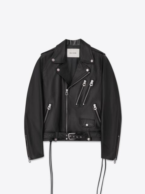 Classic BLK DNM Motorcycle jacket in calf leather with studded details, four zip pockets, snap closure and snap pocket, waist band with belt and zip cuffs MORE DETAILS - 100% Calf leather - Studded details - Asymmetrical zip closure - Two interior pockets - Decorative cords at back - Movement pleat at back - Viscose lining - Fully lined - Slim Fit