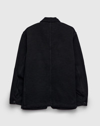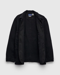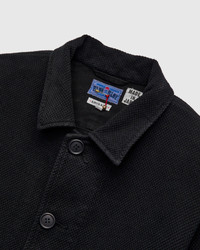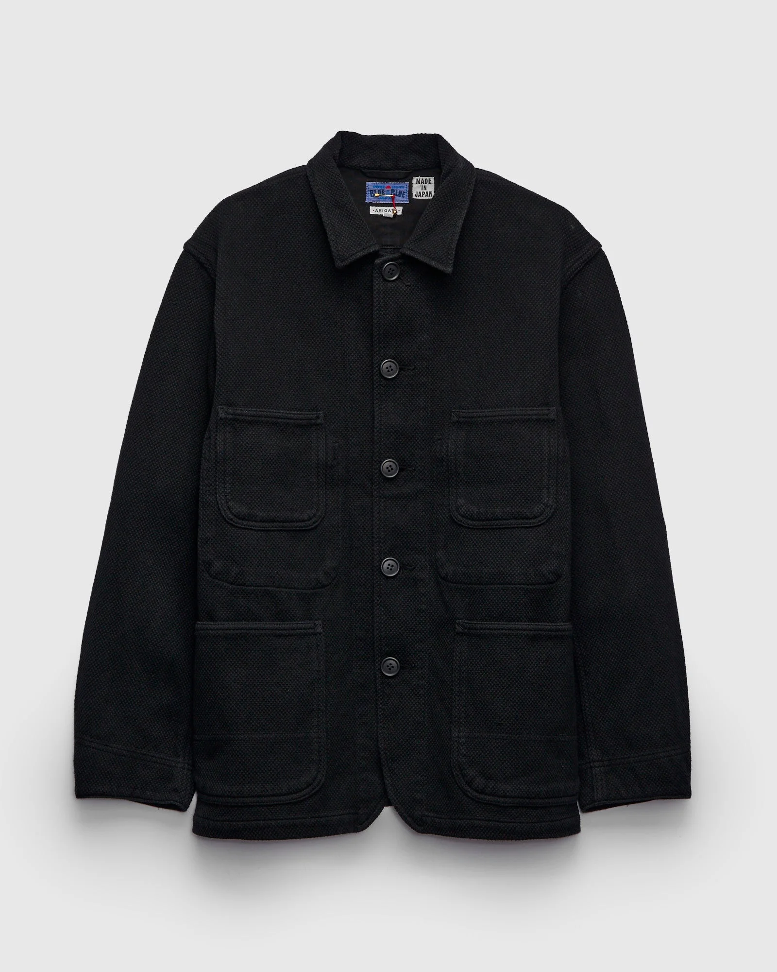 The Sashiko Coverall Jacket from Blue Blue Japan seamlessly marries contemporary styling with traditional Japanese sashiko fabric. Renowned for its exceptional durability and history in martial arts, this Double Cloth Sashiko fabric sports a substantial feel and loosely-woven texture. The jacket is hand-dyed a deep black color, yielding soft solid tone that will patina with wear and flourish with age. Equipped with a versatile multi-pocket design, tonal buttons, and a cotton-lined placket. - Regular fit - Medium-weight Japanese sashiko fabric - Tonal resin buttons - Inner and outer chest pocket - Two hand pockets at waist - 100% cotton - Made in Japan