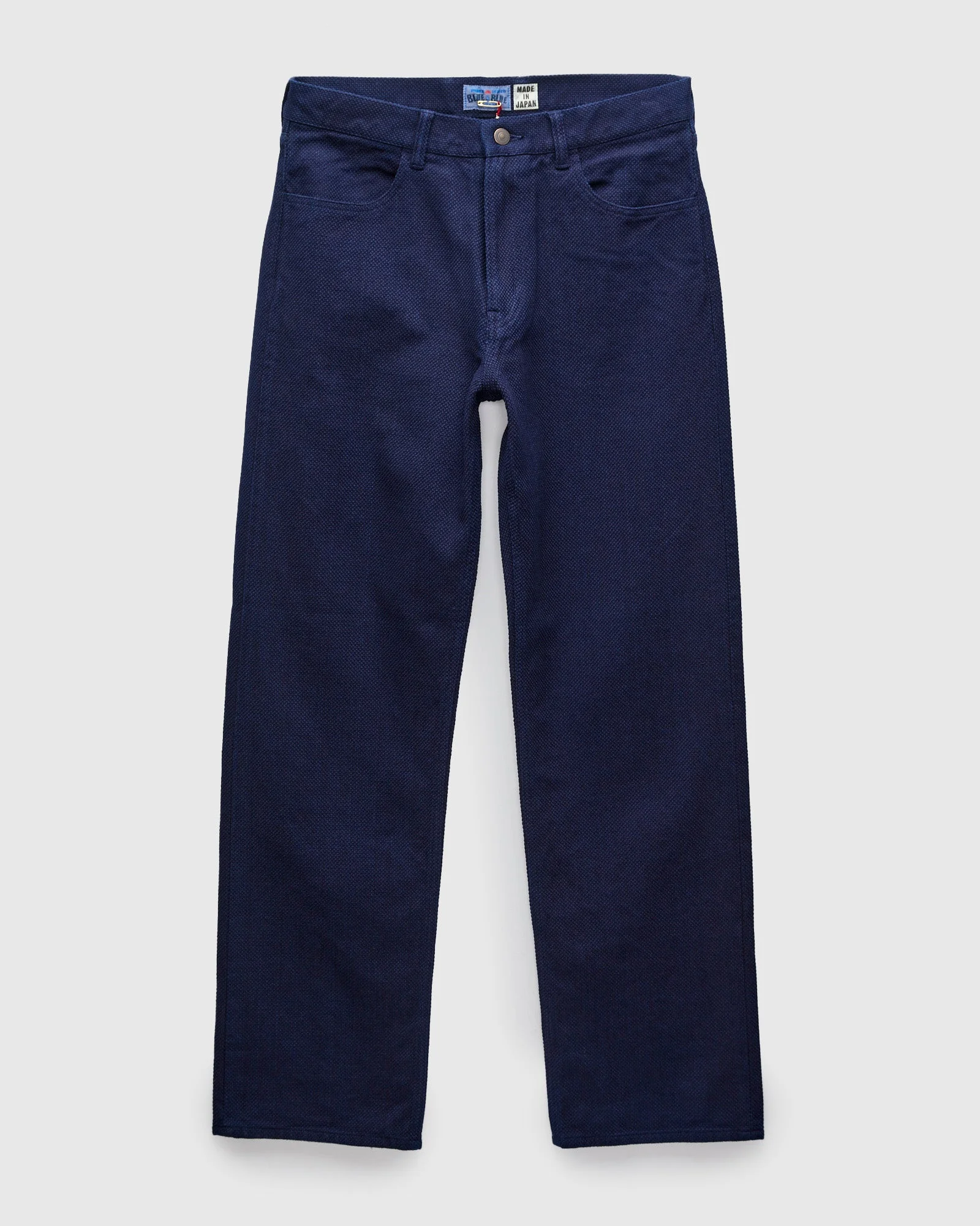 Hand-dyed with pure indigo, these pants from Blue Blue Japan offer a traditional Japanese sashiko fabric in a familiar 5-pocket style. Renowned for its exceptional durability and history in martial arts, the Double Cloth Sashiko fabric sports a substantial feel and loosely-woven texture. The pants are hand-dyed a deep indigo color, yielding a beautiful blue shade that will fade with wear and flourish with age. Fitted with traditional workwear-style detailing, and a Japanese YKK zipper fly. - Straight fit - Double cloth sashiko fabric - Hand-dyed indigo, will fade with use - Weathered copper top button - Japanese YKK zipper fly - Two slant front pockets, two rear patch pockets - 100% cotton - Made in Japan