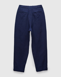 The Sashiko Trousers by Blue Blue Japan seamlessly marry contemporary tailoring with traditional Japanese sashiko fabric. Renowned for its exceptional durability and history in martial arts, this Double Cloth Sashiko fabric sports a substantial feel and loosely-woven texture. The trousers are hand-dyed a deep indigo color, yielding a beautiful blue shade that will fade with wear and flourish with age. Finished with a double pleated front, welted pockets, and a Japanese YKK zipper fly. - Hand-dyed pure indigo - Double cloth sashiko fabric - Relaxed tapered fit, roomy top block with taper throughout - Japanese YKK zipper fly - Two slant front pockets, two rear welt pockets - 100% cotton - Made in Japan