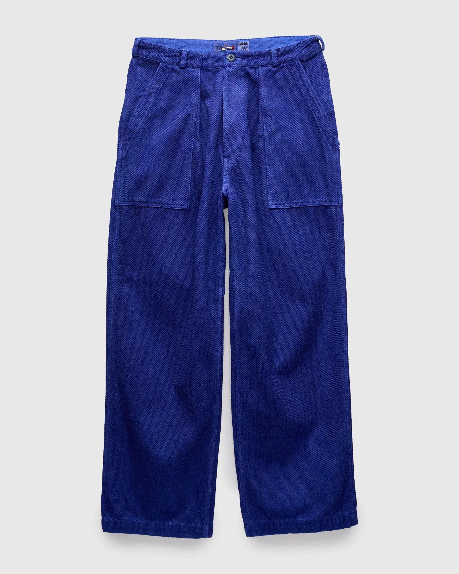 Originally sewn using a natural ecru fabric, the Hand Dyed Sashiko Fatigue Pants feature an indigo overdye yielding a rich cerulean-blue tone. The pants are sewn using Blue Blue Japan's raised sashiko cloth, a hard-wearing textile woven with a textured running top-stitch. Cut in a straight leg fit with classic fatigue pant detailing throughout. - Straight leg fit - Raised stitch sashiko cloth - Hand-dyed indigo - Large fatigue pockets at the waist - Rear flap pockets - Japanese YKK zipper fly - 100% cotton - Made in Japan