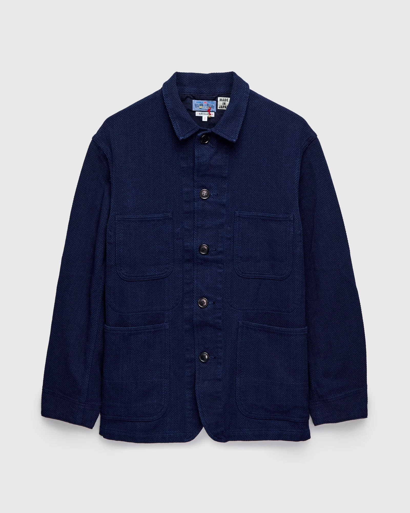The Sashiko Coverall Jacket by Blue Blue Japan showcases the brand's three-decade mastery of indigo craftsmanship. Blue Blue Japan's lightweight sashiko fabric, is a lightweight version of the brands signature sashiko fabric. This timeless piece boasts a versatile multi-pocket layout, tonal buttons, and a cotton-lined placket. Dyed with natural indigo, the jacket's unique character will evolve and mature over time, gradually fading into an antique blue shade reminiscent of traditional Japanese denim. - Indigo-dyed will fade with wear - Regular fit - Lightweight Japanese sashiko fabric - Tonal resin buttons - Inner and outer chest pocket - Two hand pockets at waist - 100% cotton - Made in Japan Model is 5'10" and 180lbs wearing a size Medium.