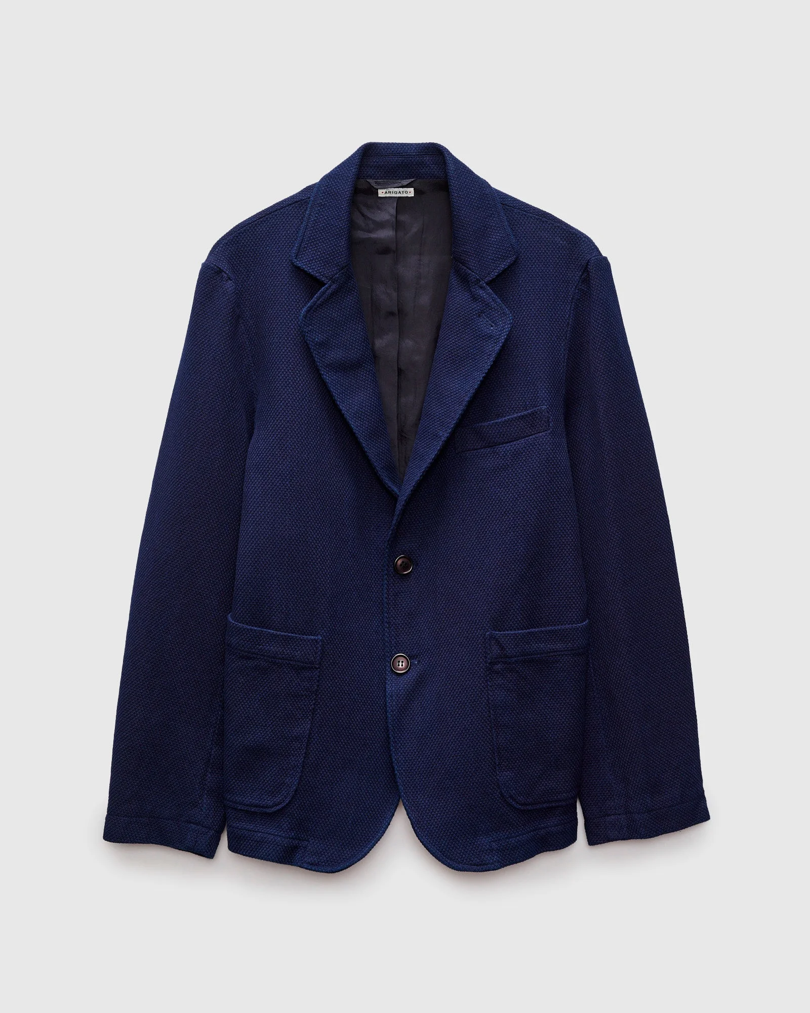 Blue Blue Japan's Light Sashiko fabric, is a lightweight version of the brand's dobby weave sashiko cloth. Combining traditional suiting with Japanese workwear influences, this jacket features a 2B sport coat design with patch pockets at the waist. Dyed with natural indigo, the jacket will evolve and mature over time, gradually fading into an antique blue reminiscent of traditional Japanese denim. - Indigo-dyed will fade with wear - Regular fit - Lightweight Japanese sashiko fabric - Resin buttons - Single chest pocket - Two hand pockets at waist - 100% cotton - Made in Japan