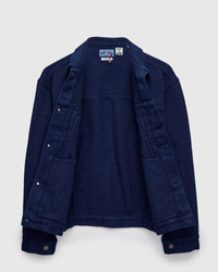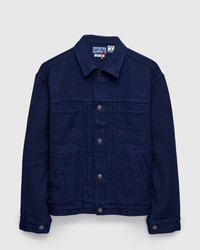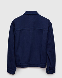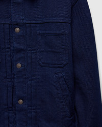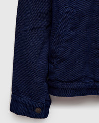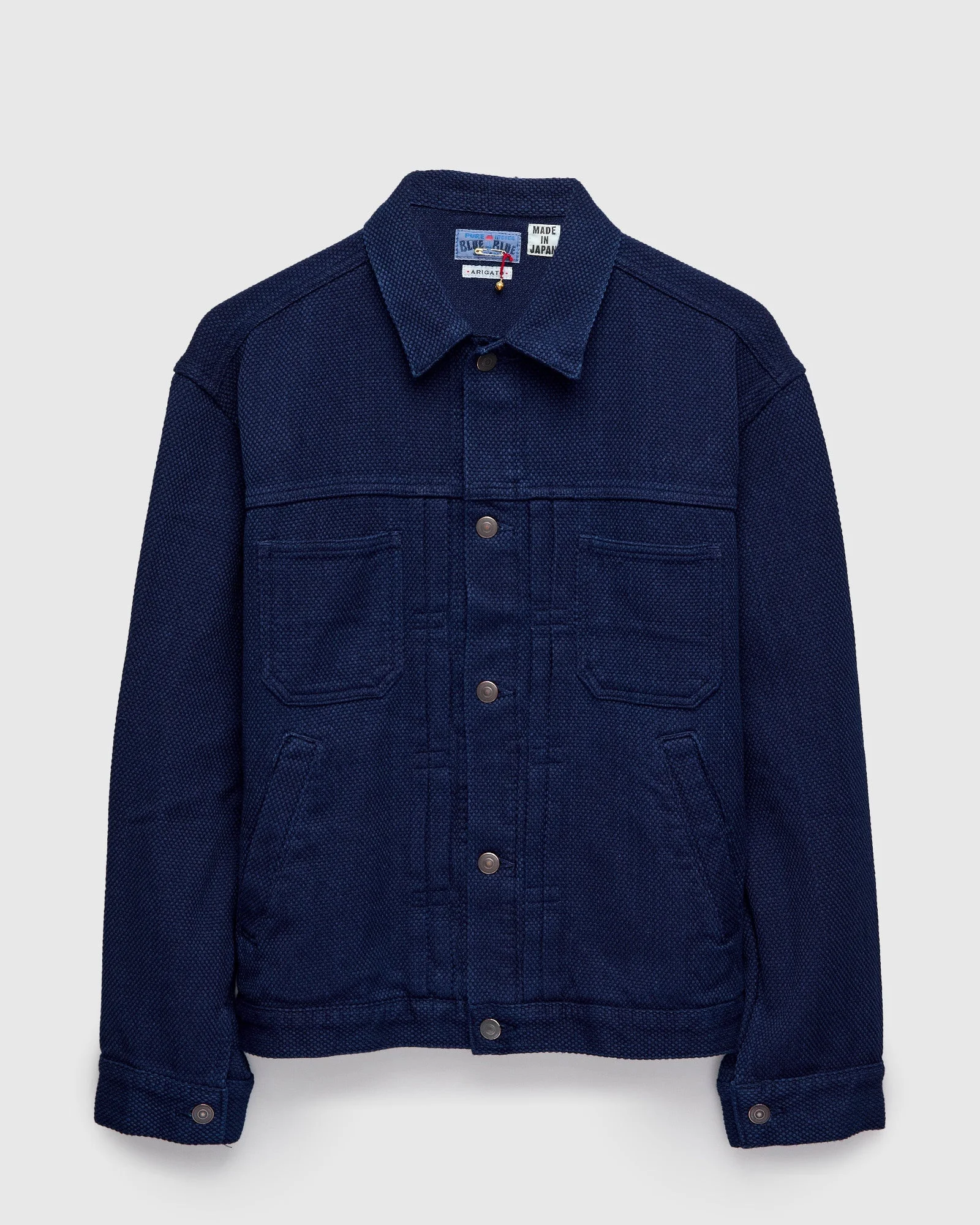 Hand-dyed with pure indigo, this trucker-style jacket from Blue Blue Japan offers a lightweight Japanese sashiko fabric in a familiar workwear style. Renowned for its exceptional durability and history in martial arts, the Double Cloth Sashiko fabric sports a substantial feel and loosely-woven texture. The jacket is hand-dyed a deep indigo color, yielding a beautiful blue shade that will fade with wear and flourish with age. Fitted with traditional workwear-style detailing, and convenient hand pockets at the waist. - Regular fit - Lightweight Japanese sashiko fabric - Aged copper buttons - Two button chest pocket - Two hand pockets at waist - 100% cotton - Made in Japan