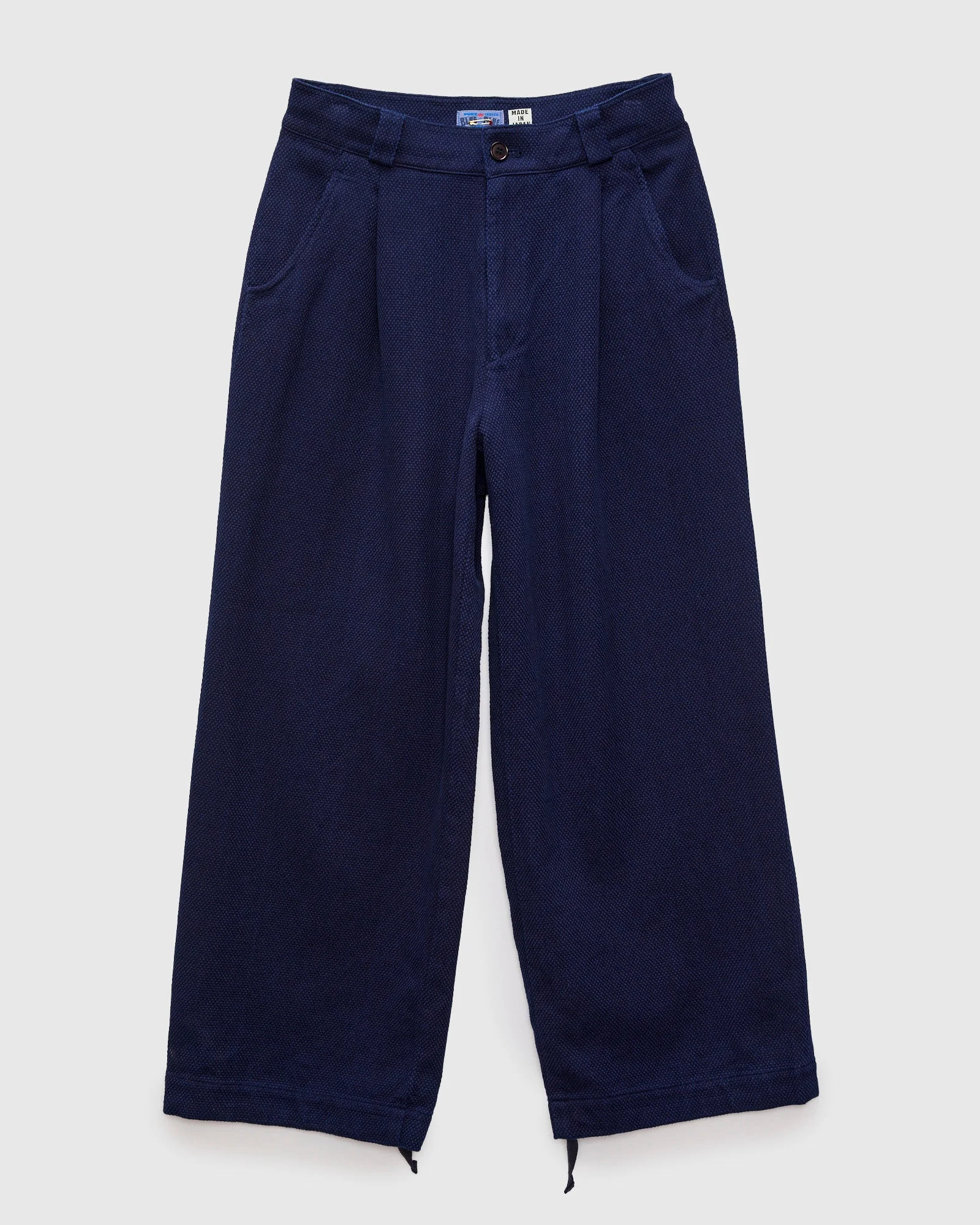 Blue Blue Japan's Light Sashiko fabric, is a lightweight version of the brand's dobby weave sashiko cloth. The trousers are hand-dyed a deep blue color using genuine indigo, yielding a beautiful blue shade that will fade slowly overtime. Cut in a wide leg fit with tailored pleats at the front. - Hand-dyed pure indigo - Lightweight sashiko fabric - Wide leg fit - Japanese YKK zipper fly - Two slant front pockets, two rear welt pockets - 100% cotton - Made in Japan