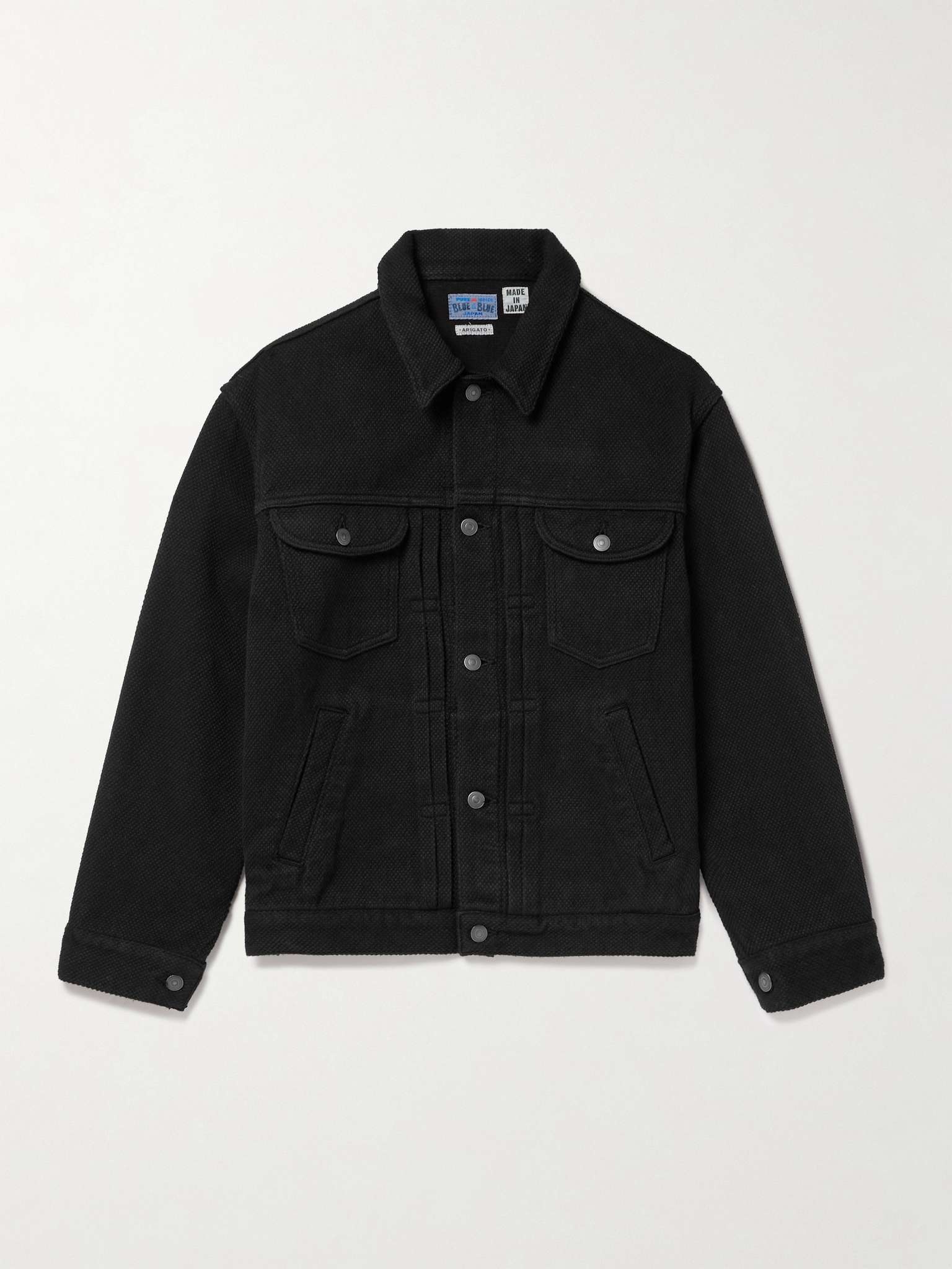 Sashiko is a Japanese style of embroidery used to strengthen fabric. Made using the heritage technique, Blue Blue Japan's trucker jacket is crafted from cotton-canvas and has signature design details, like front pleats and practical pockets. Size & Fit - Fits true to size. Take your normal size - Designed for a boxy fit - Mid-weight, non-stretchy fabric - Model is shown wearing a M - Model measures: chest 38"/ 96cm, height 6'2"/ 188cm Details & Care - Black cotton-canvas - Button fastenings - 100% cotton - Machine wash
