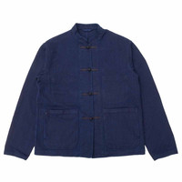 - A stand-collar jacket featuring slender frog closures at the front. It is made of Blue Blue Japan original Sashiko fabric, a long-standard material designed for comfort. Using natural indigo yarn dyed with "Kase Dyeing (Skein Dyeing)", it features a subtle vertical unevenness. Double-weaving on a dobby loom makes it thick and resilient without being heavy. By drying without high heat during both the yarn dyeing and fabric weaving processes, it achieves a soft, fluffy texture. It is a jacket with a beautiful silhouette that you can enjoy ageing over time. - 100% Cotton - Made in Japan - Model Wearing Size: M (171cm 65kg)