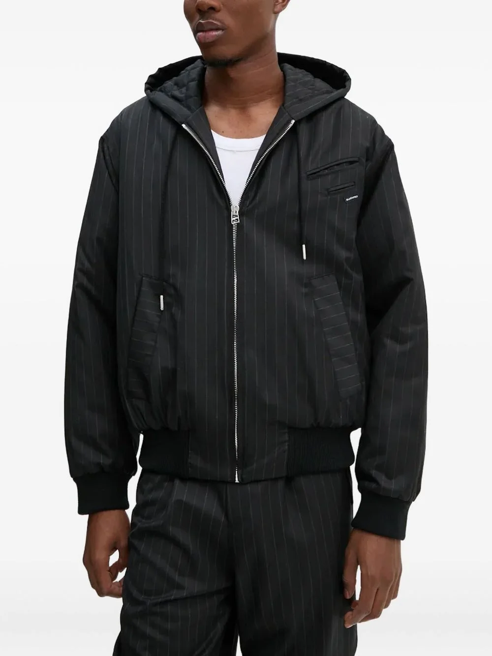 pinstripe hooded jacket Highlights - Black - Pinstripe pattern - Zip fastening - Drawstring hood - Welt pockets - Quilted lining Imported Composition Lining: Acetate 100%, Polyester 100% Outer: Wool 100% Washing instructions Read Manufacturer Guidelines