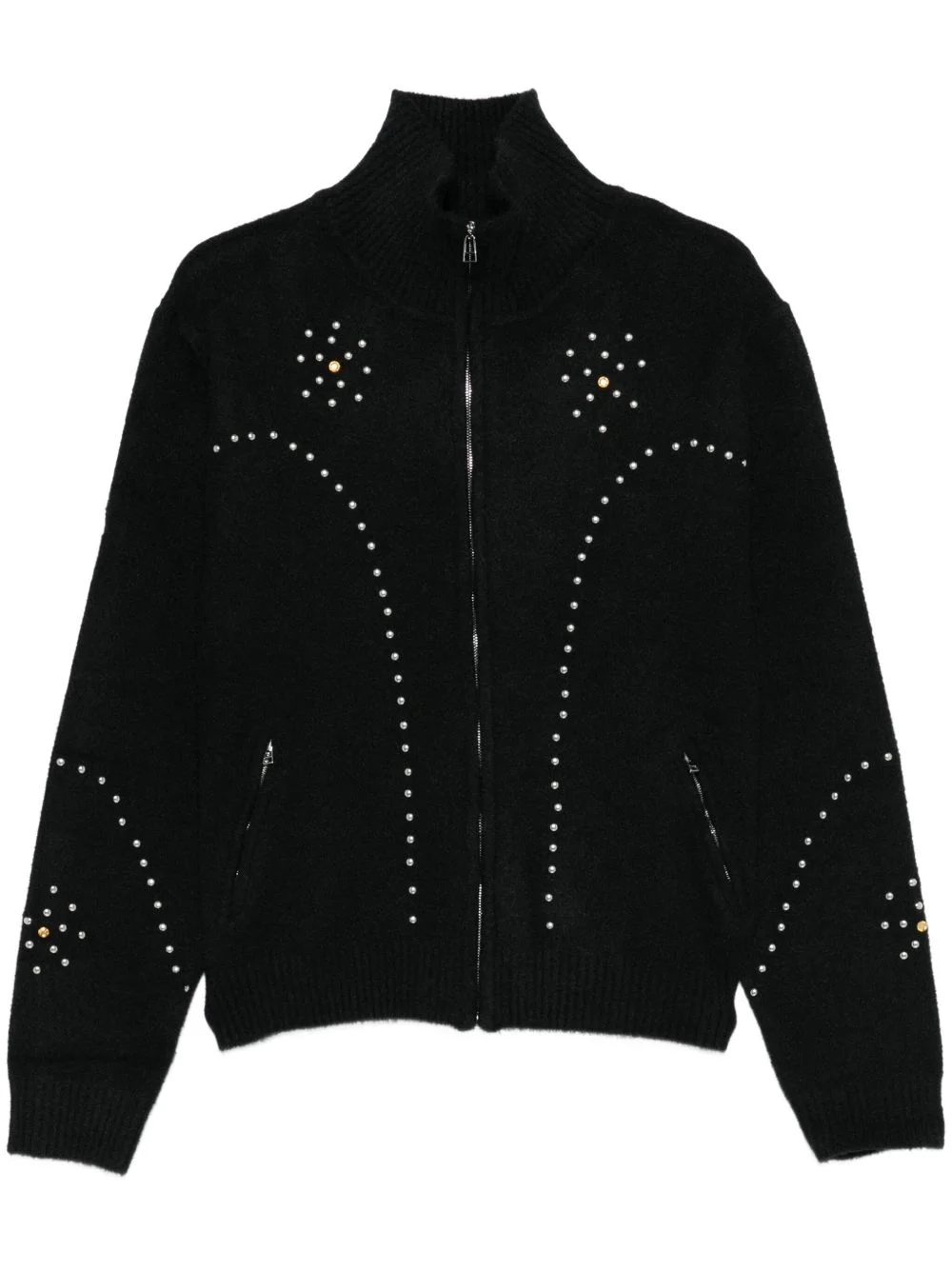 zip-up cardigan Highlights - Black - Zip fastening - Long sleeves - Ribbed trims - Stud embellishment Imported Composition Nylon 60%, Viscose 30%, Polyester 10%