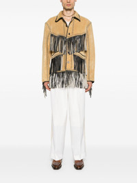 Appalachian fringed suede jacket Highlights - Caramel brown/black - Calf suede - Fringe detailing - Whipstitch trim - Classic collar - Front button fastening - Long sleeves - Two front patch pockets - Straight hem Imported Composition Calf Suede 100% SIZE & FIT Model measurements Height 6 ft 1 in(1.86 m) Bust/Chest 37.4 in(95 cm) Hips 36.22 in(92 cm) Waist 29.52 in(75 cm) FittingInformation Designed for a boxy fit, intended for a loose fit throughout Suede leather has a soft and treated construction offering some flexibility This piece fits true to size – take your usual size