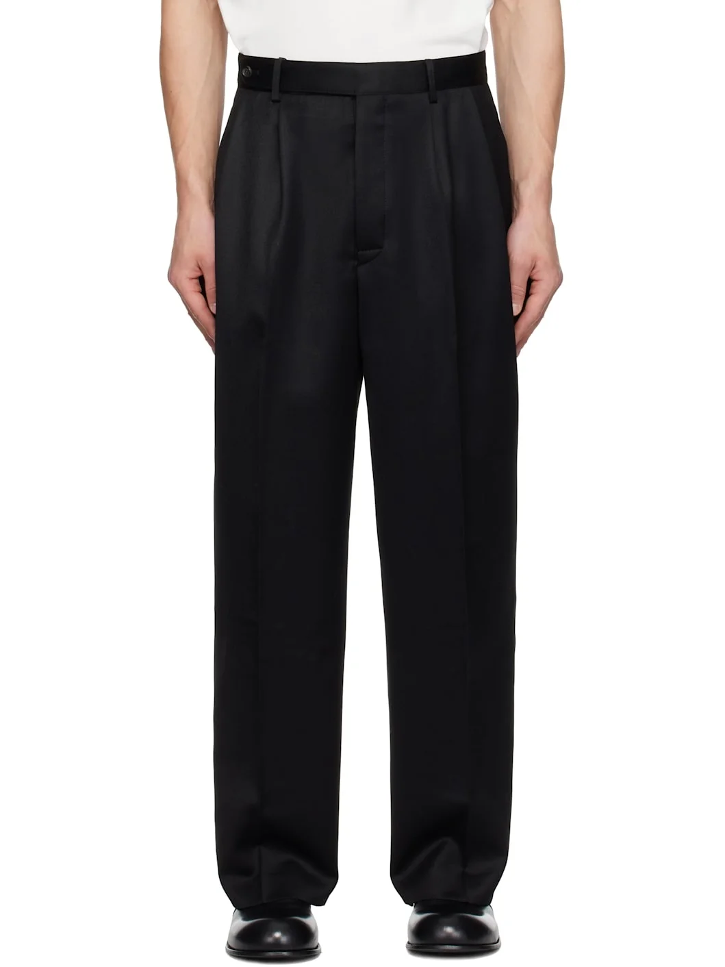 Wide-leg wool barathea trousers. · Belt loops and button tab at waistband · Four-pocket styling · Button-fly · Pleats at front · Creased legs This item is part of a limited run of 46. Supplier color: Black 100% wool. Made in Romania 251169M191002