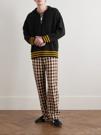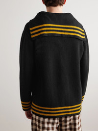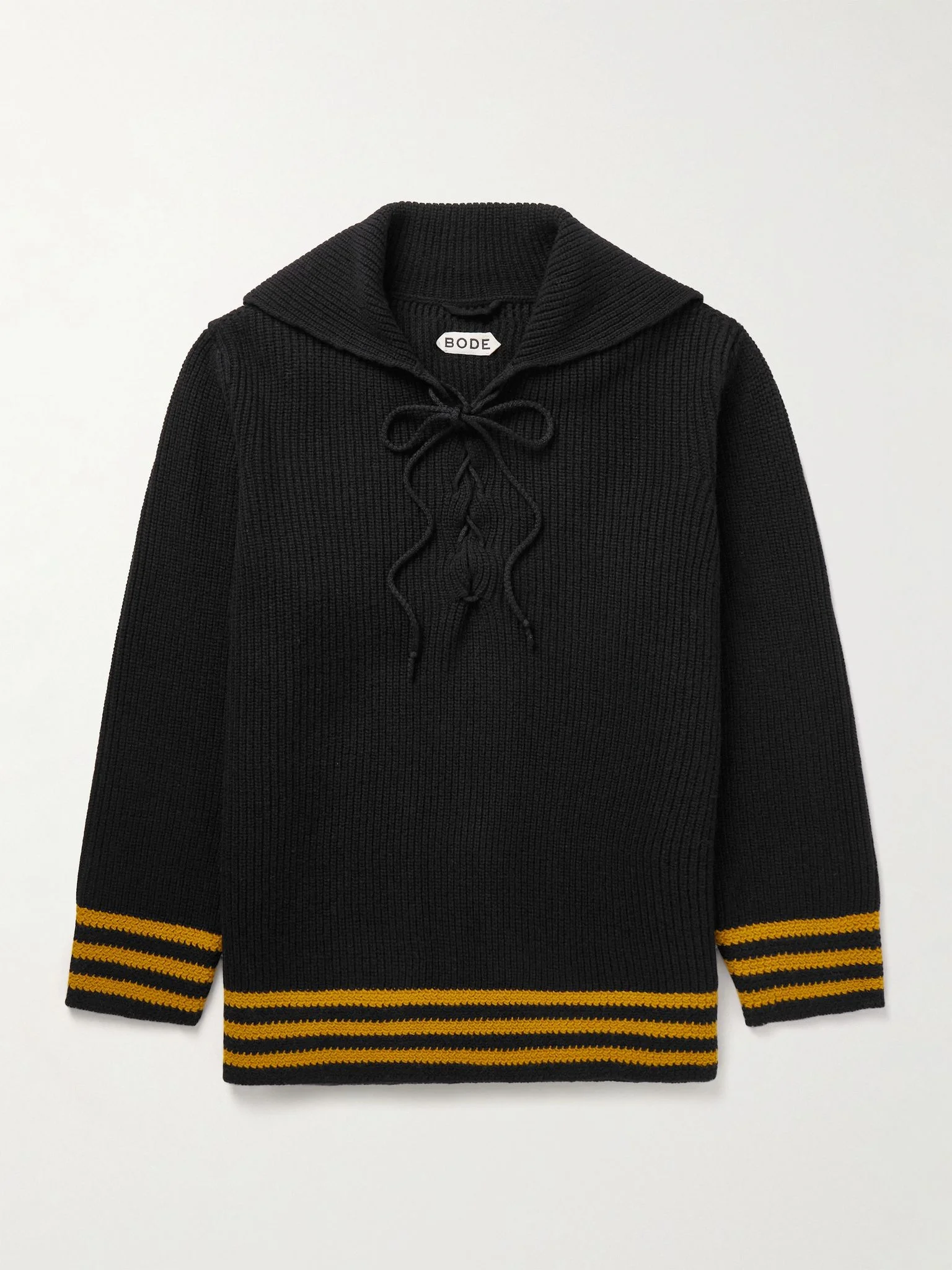 BODE's sweater has an exaggerated sailor-inspired collar that's held in place by lace-up ties along the front. A nod to styles from the '60s, it's knitted from black ribbed wool patterned with mustard stripes. Size & Fit - Fits true to size. Take your normal size - Designed for a relaxed fit - Mid-weight knit - Model is shown wearing M - Model measures: chest 38"/ 96cm, height 6'1"/ 185cm Details & Care - Black and mustard wool - Tie fastening - 100% wool - Dry clean
